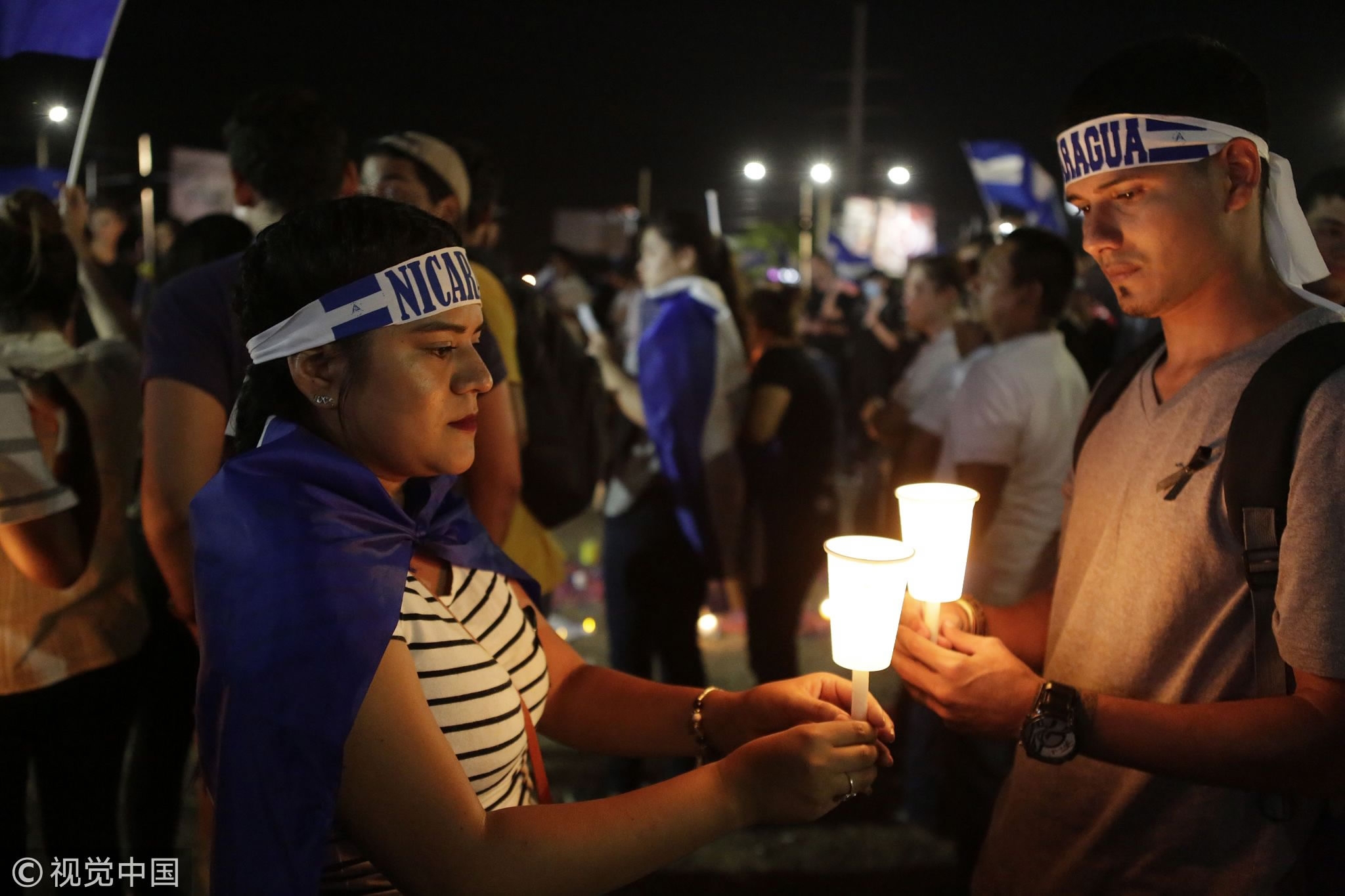 Students carry candles during a protest demanding Nicaraguan President Daniel Ortega and his wife, Vice President Rosario Murillo to step down, in Managua April 25, 2018. /VCG Photo