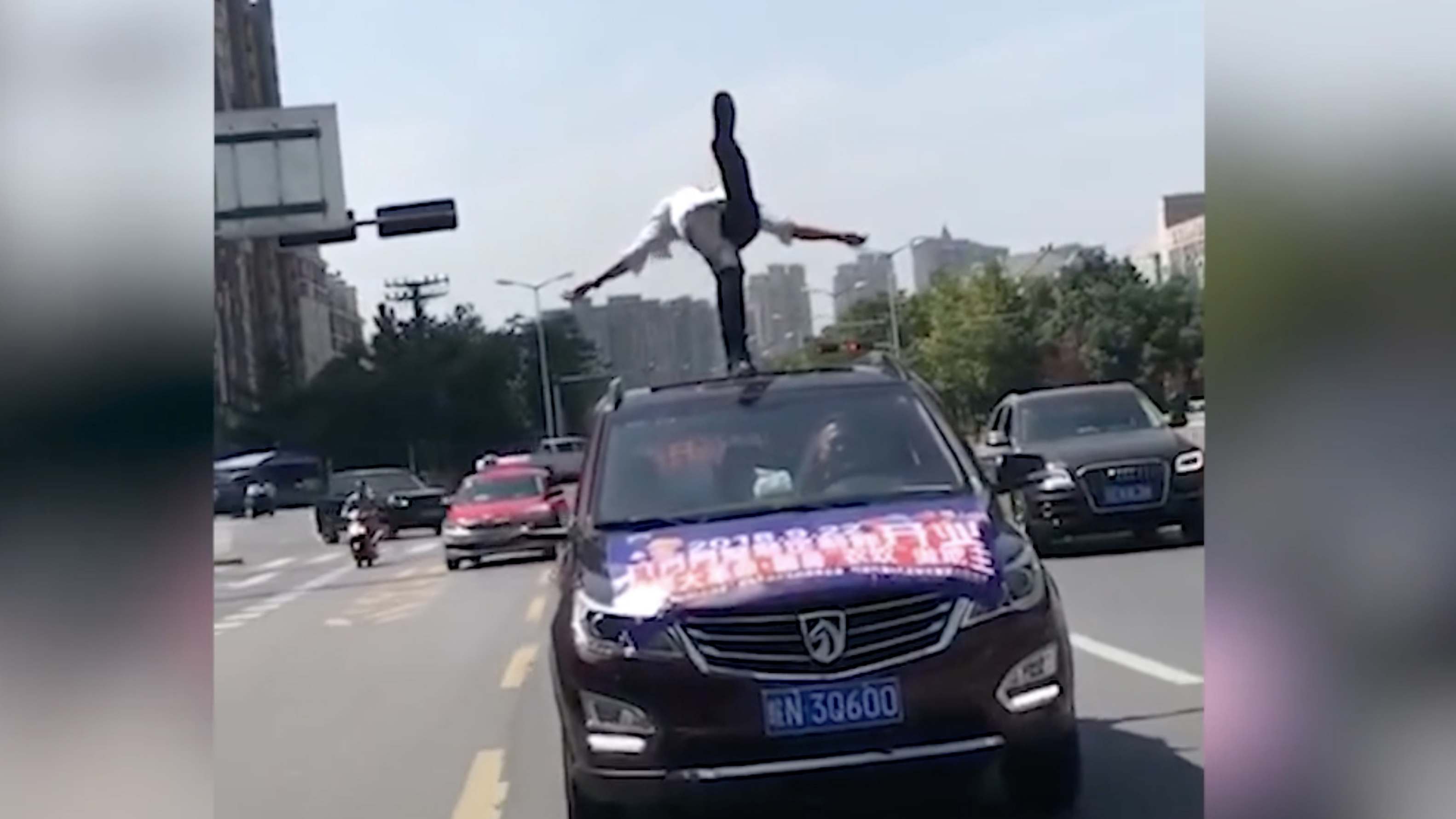A man was doing acrobatics on top of a car as part of a stunt arranged by a media company, according to police. Both the performer and the driver were fined for violating traffic rules.