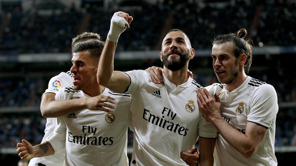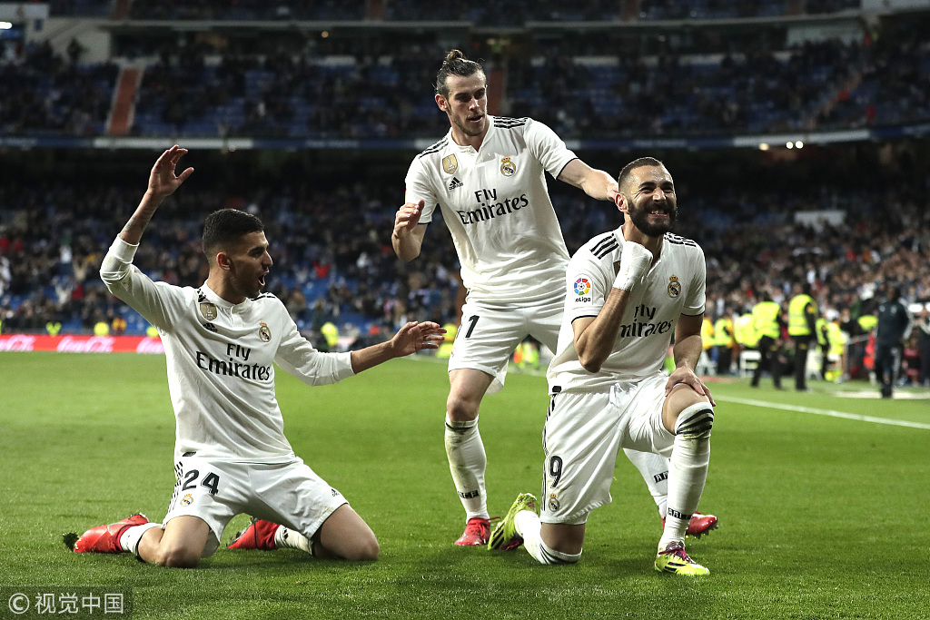 Karim Benzema (R) of Real Madrid celebrates with Dani Ceballos (L) and Gareth Bale (C) after scoring a dramatic late winner, March 31, 2019. /VCG Photo