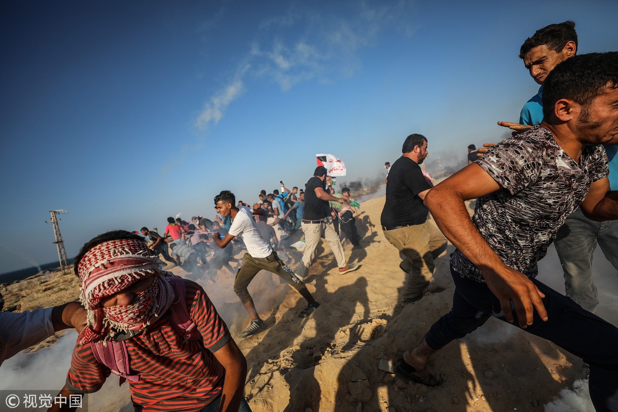Palestinians run after Israeli forces' intervention with tear gas canisters during a demonstration within 'Great March of Return' in Beit Lahia, Gaza on September 24, 2018./VCG Photo