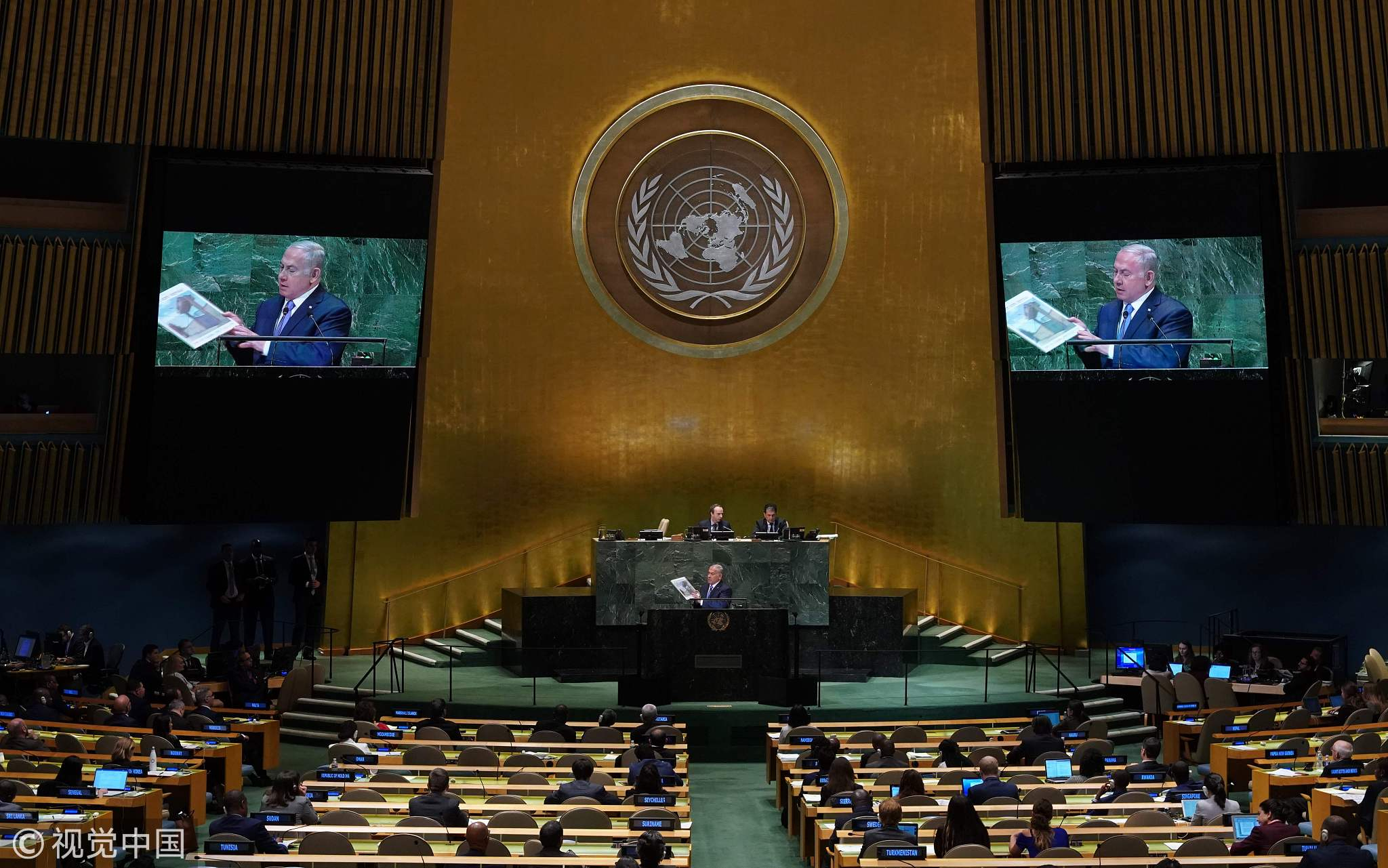 Israeli Prime Minister Benjamin Netanyahu Prime addresses the General Assembly at the United Nations in New York September 27, 2018. Netanyahu on Thursday claimed that Iran had a secret atomic warehouse in Tehran, holding up a map and a photograph of an outwardly innocuous looking building. /VCG Photo
