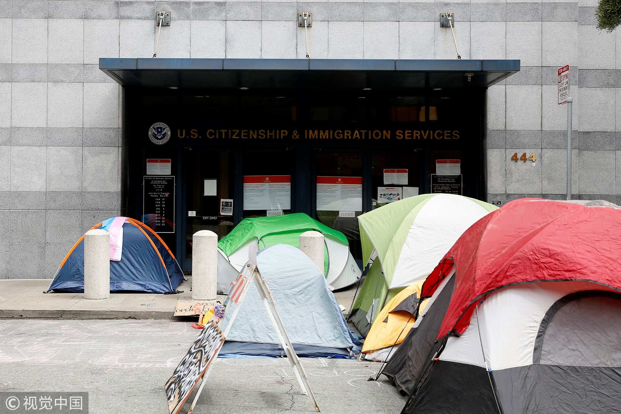 Protesters camp outside of the San Francisco office of the Immigration and Customs Enforcement to protest against US immigration policies in San Francisco, California,July 04, 2018. /VCG Photo