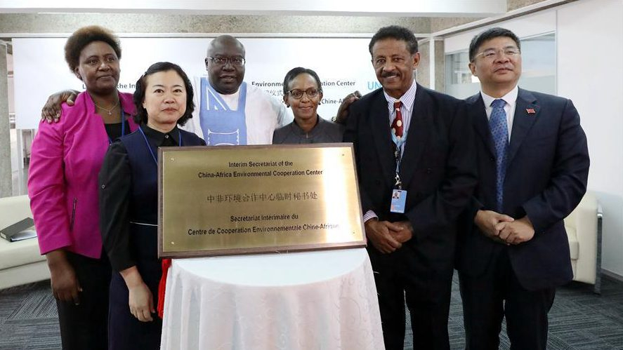 Guests unveil the Interim Secretariat of the China-Africa Environmental Cooperation Center at the United Nations Office in Nairobi, Kenya, on August 17, 2018. /Xinhua News Agency