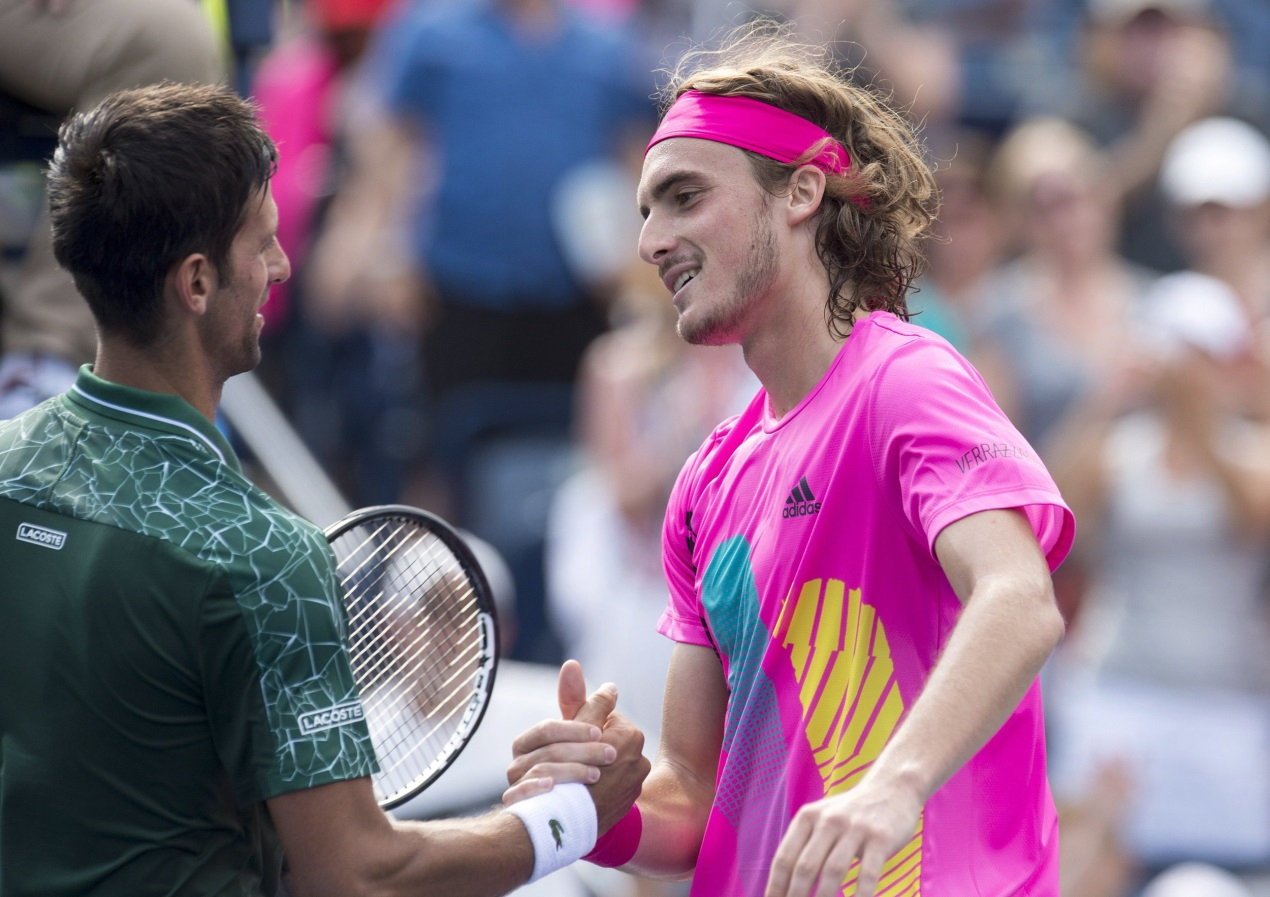 Stefanos Tsitsipas (R) of Greece is congratulated by Novak Djokovic of Serbia after defeating him during Rogers Cup tennis tournament action in Toronto on August 9, 2018. /VCG Photo