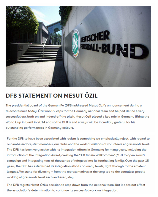 "It is regrettable that Mesut Ozil felt that he had not been sufficiently protected as a target of racist slogans.
