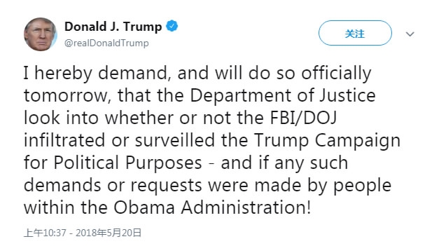 "I hereby demand, and will do so officially tomorrow, that the Department of Justice look into whether or not the FBI/DOJ infiltrated or surveilled the Trump Campaign for Political Purposes – and if any such demands or requests were made by people within the Obama Administration!" Trump wrote on Twitter.