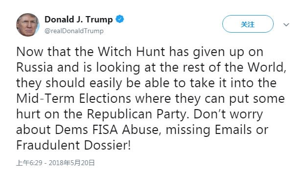 "Now that the Witch Hunt has given up on Russia and is looking at the rest of the World, they should easily be able to take it into the Mid-Term Elections where they can put some hurt on the Republican Party," he wrote.