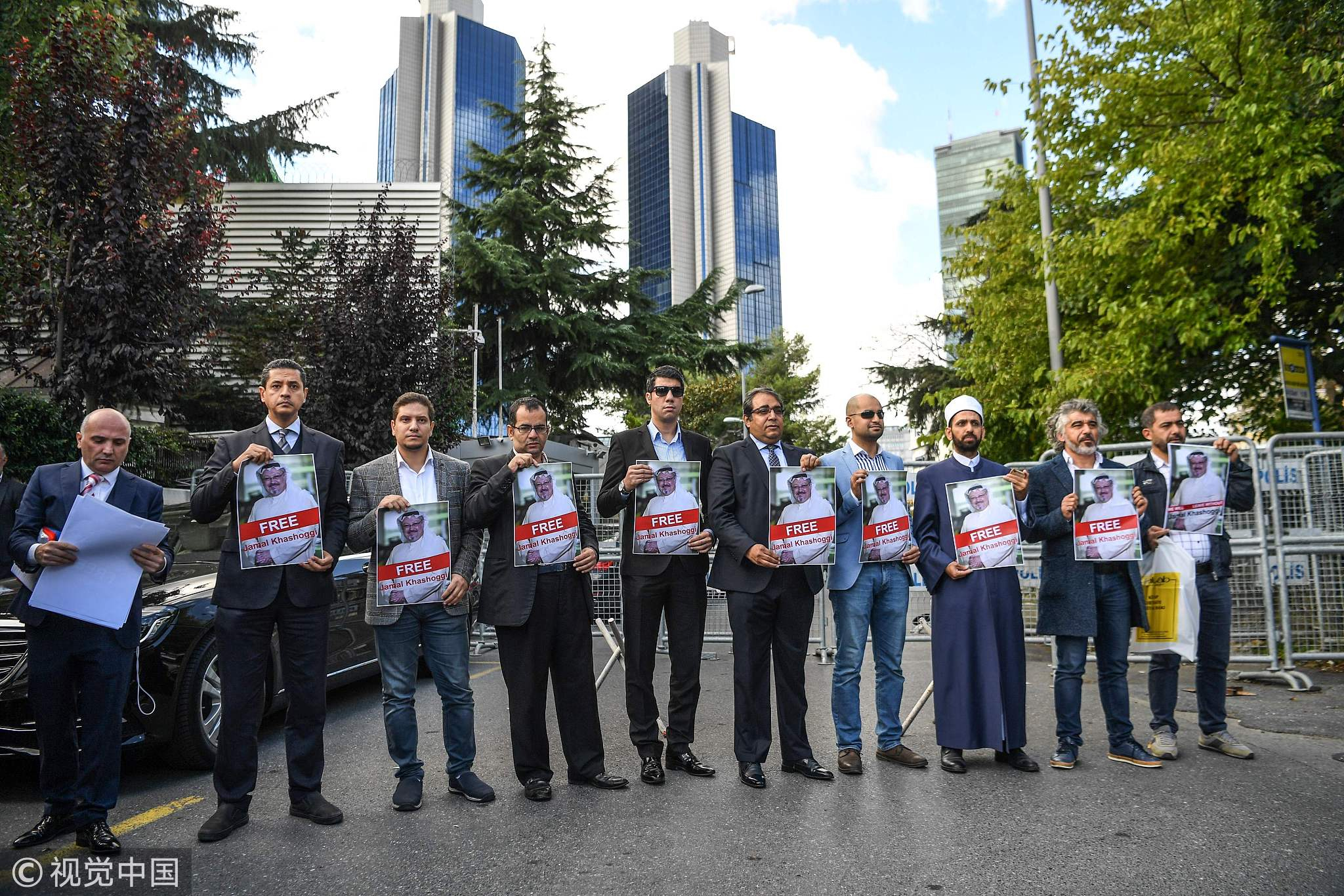 Protesters hold pictures of missing journalist Jamal Khashoggi, October 5, 2018. /VCG Photo