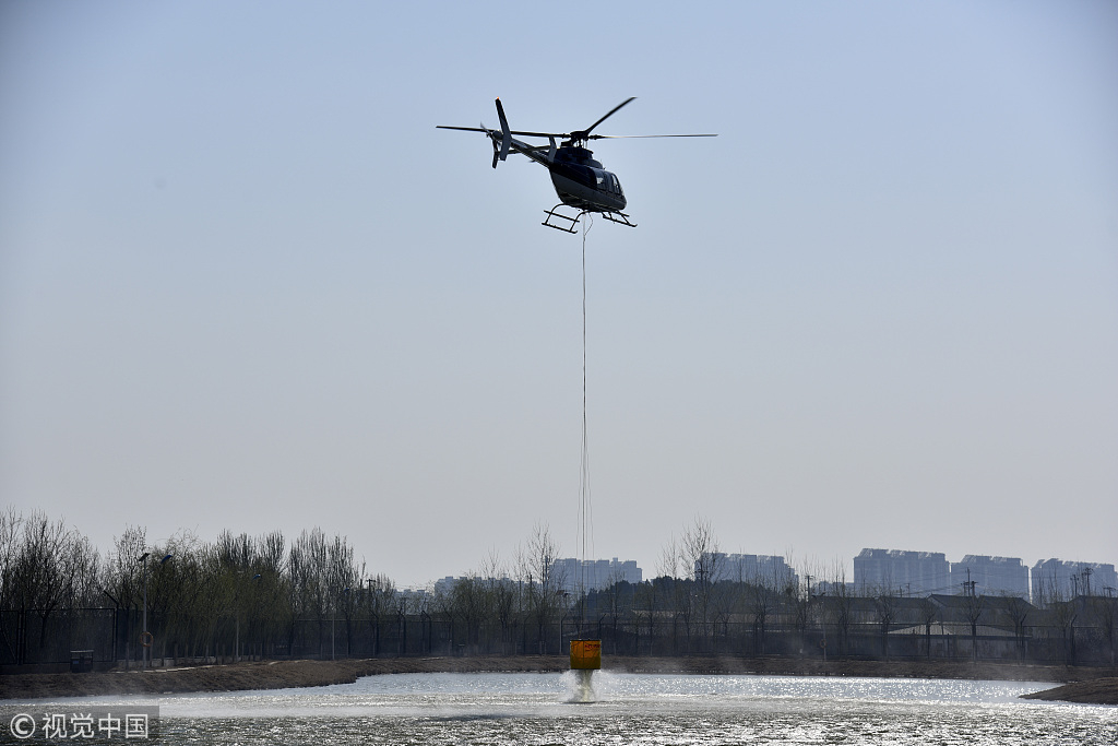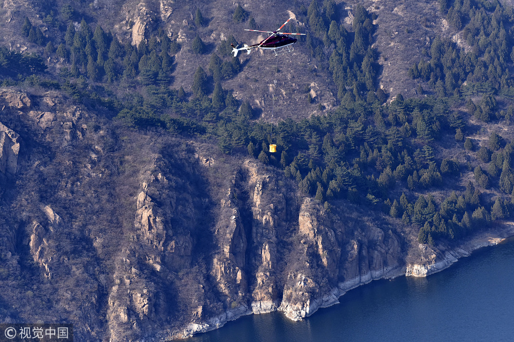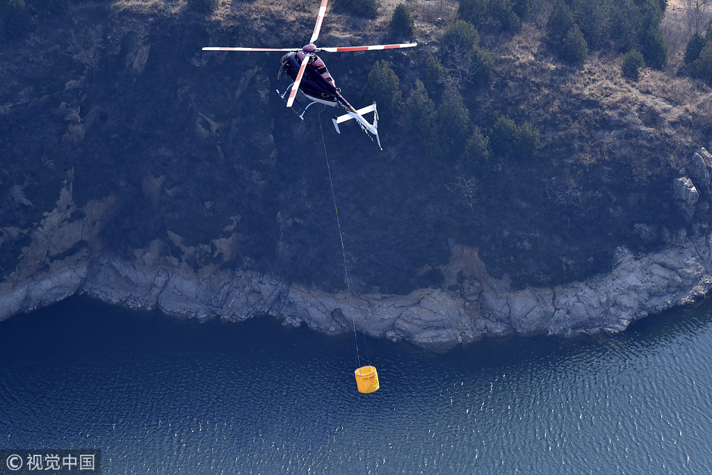 Beijing’s suburban Miyun District conducted its first-ever helicopter firefighting drill on Wednesday. /VCG Photo