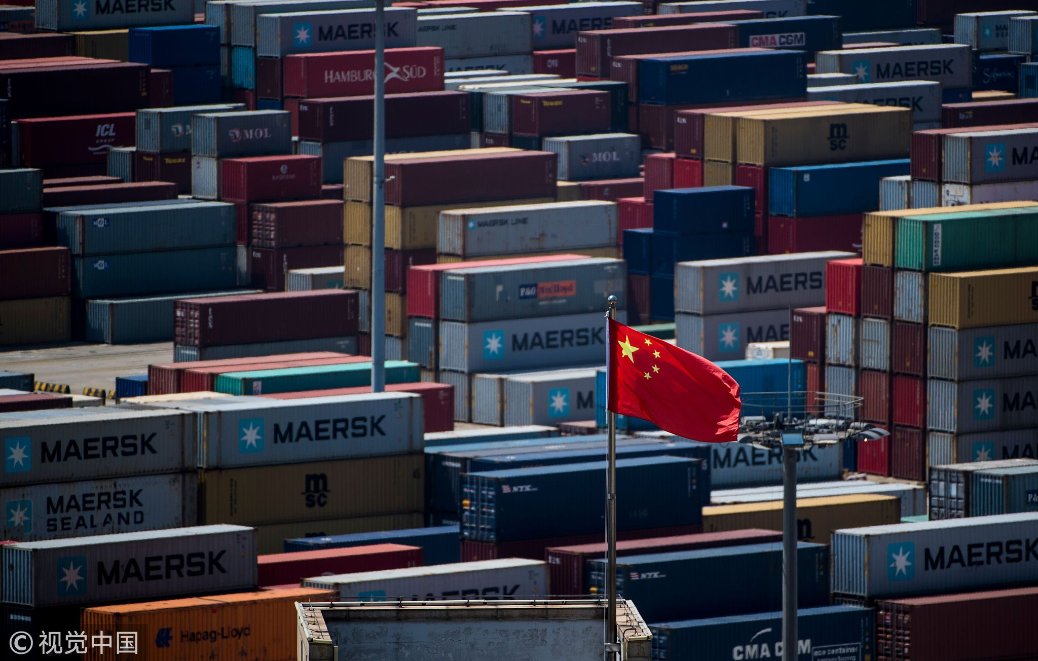 A Chinese flag is seen in front of containers at the Yangshan Deep-Water Port, an automated cargo wharf, in Shanghai, April 9, 2018. /VCG Photo