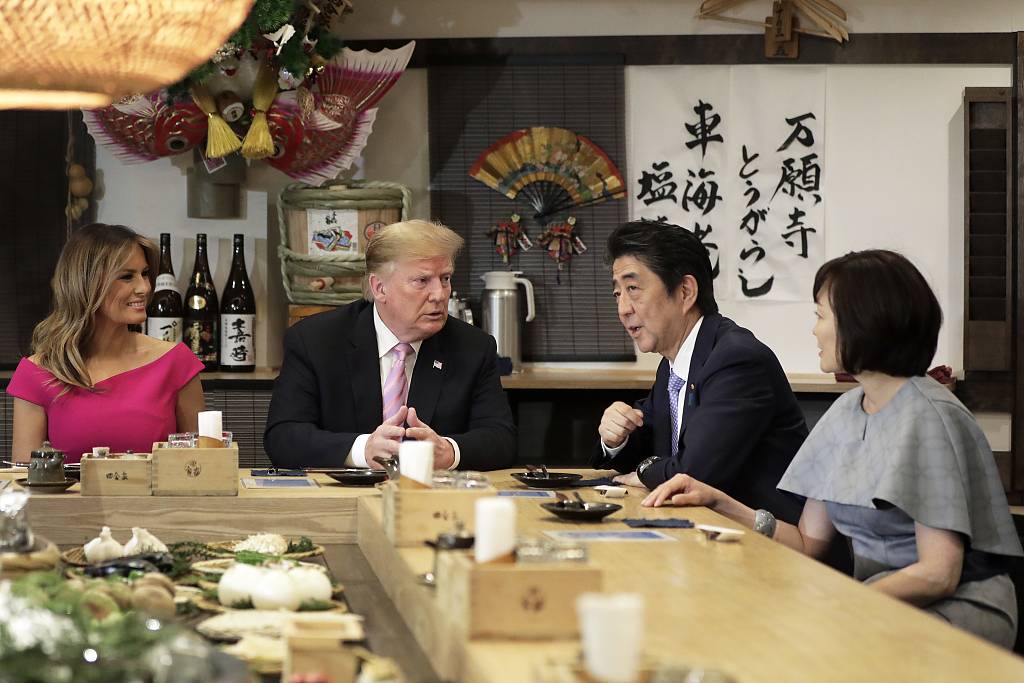 U.S. President Donald Trump (2 L) speaks with Japan's Prime Minister Shinzo Abe (2 R) during a dinner at the Inakaya restaurant in Tokyo, Japan, May 26, 2019. /VCG Photo