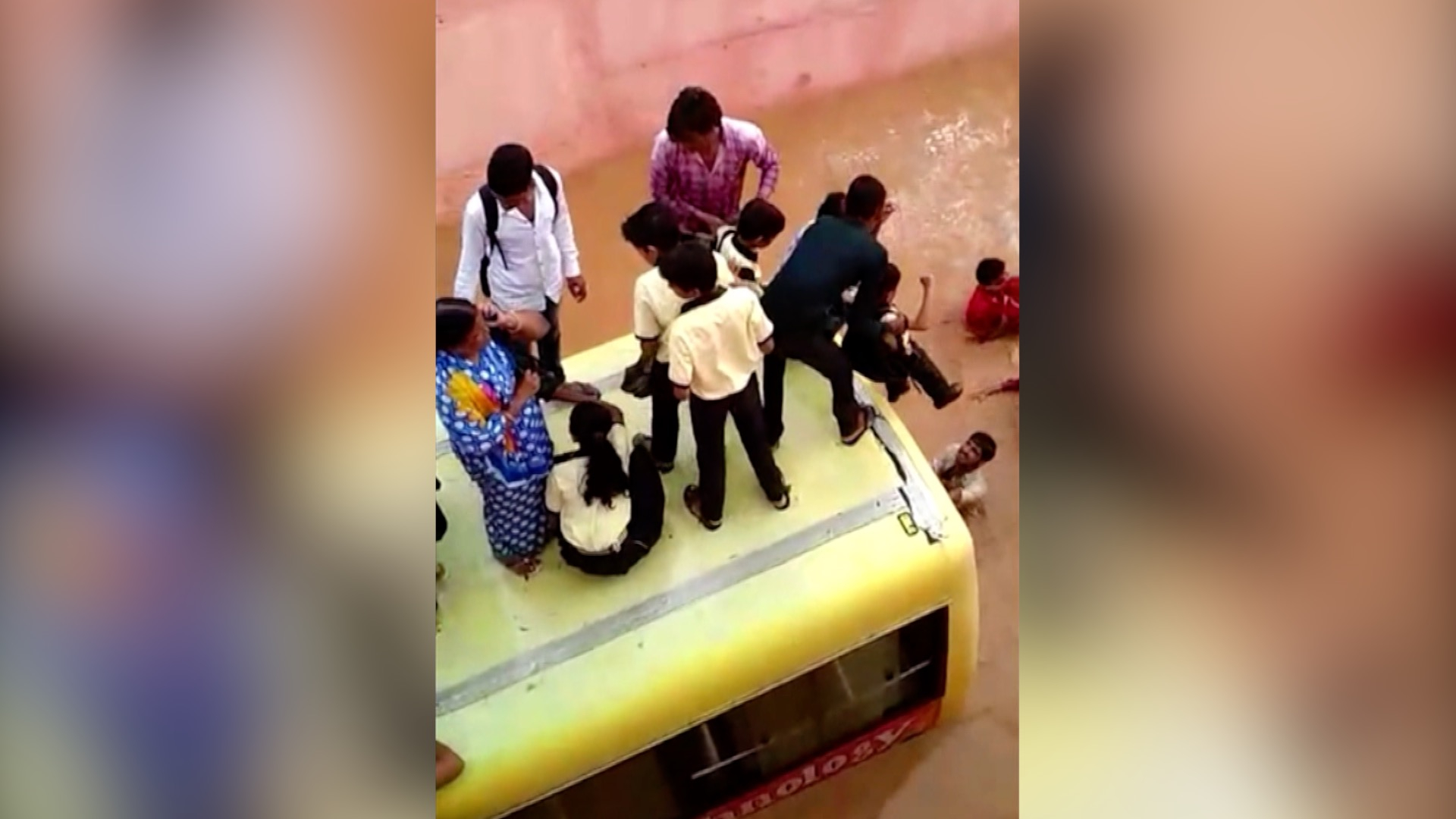 Video footage captured on Thursday in Dausa, India, shows a group of students on top of a school bus that got trapped in a waterlogged underpass. Local residents can be seen carrying the pupils on their shoulders away from the bus as others dangle umbrellas and rope from the safety above.