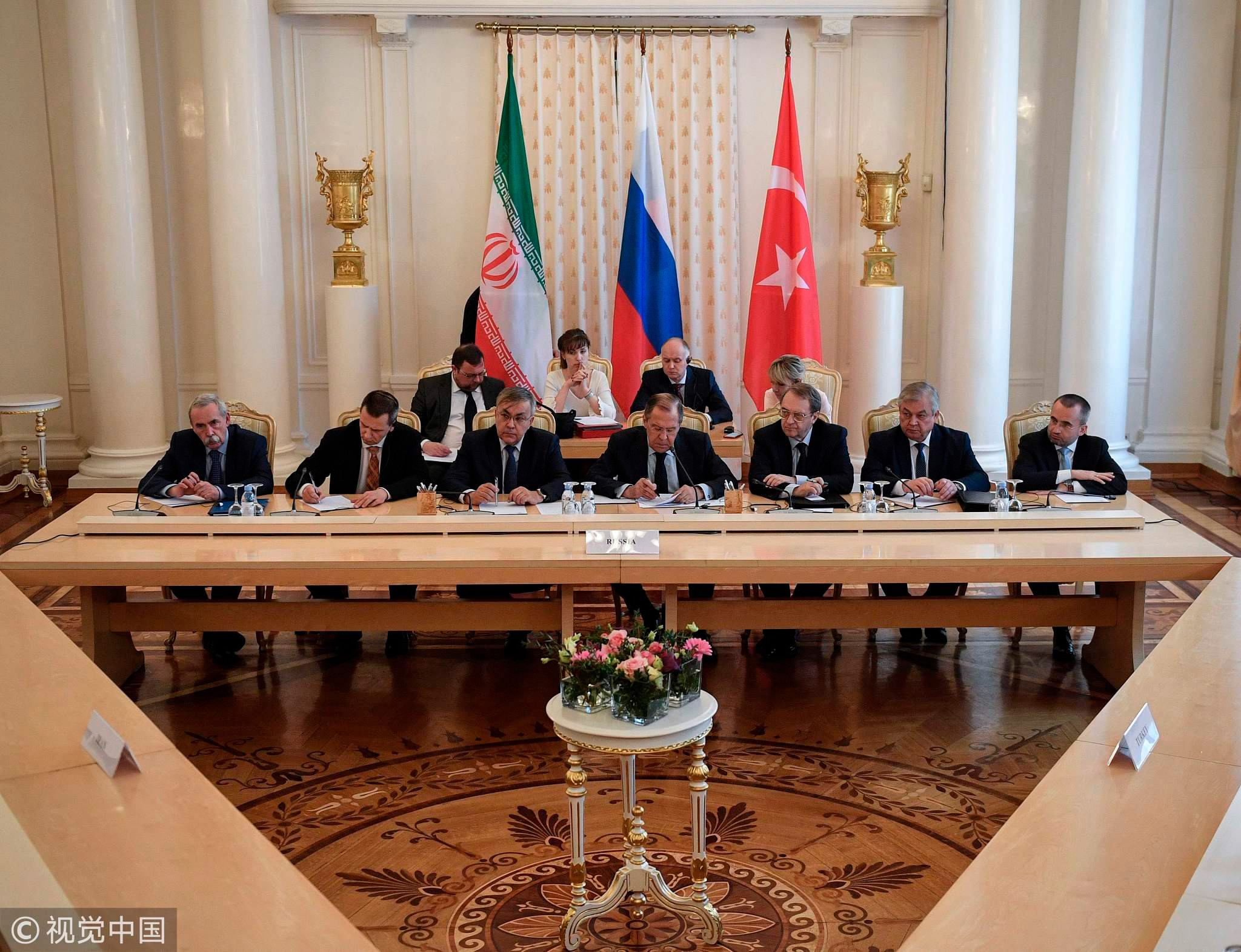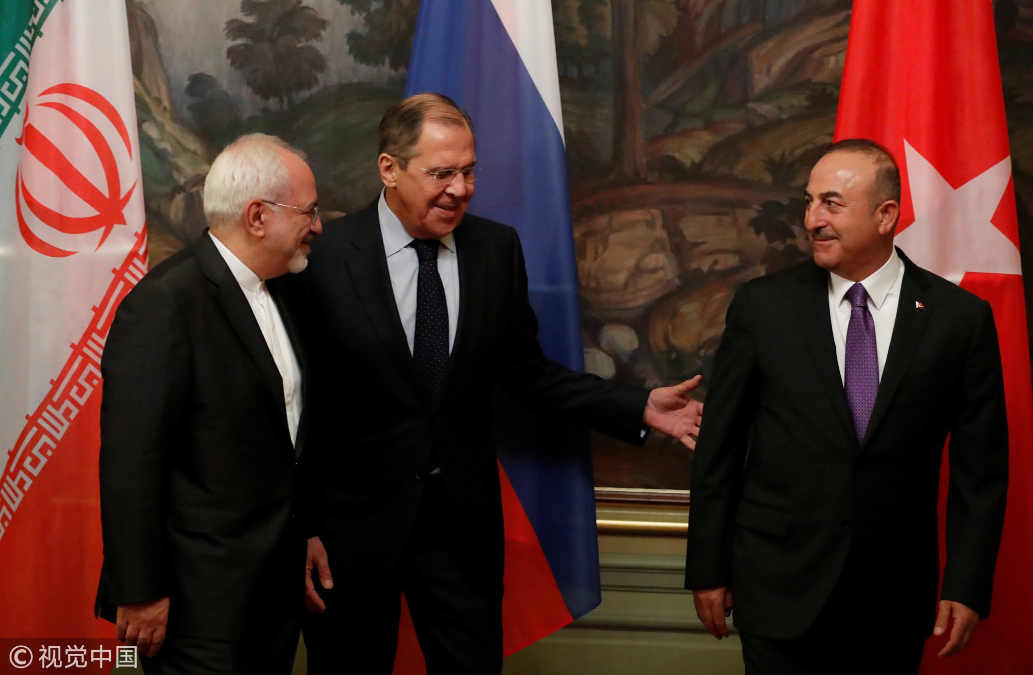 Russian Foreign Minister Sergei Lavrov meets with his Turkish counterpart Mevlut Cavusoglu and Iran's Foreign Minister Mohammad Javad Zarif in Moscow on April 28, 2018. /VCG Photo
