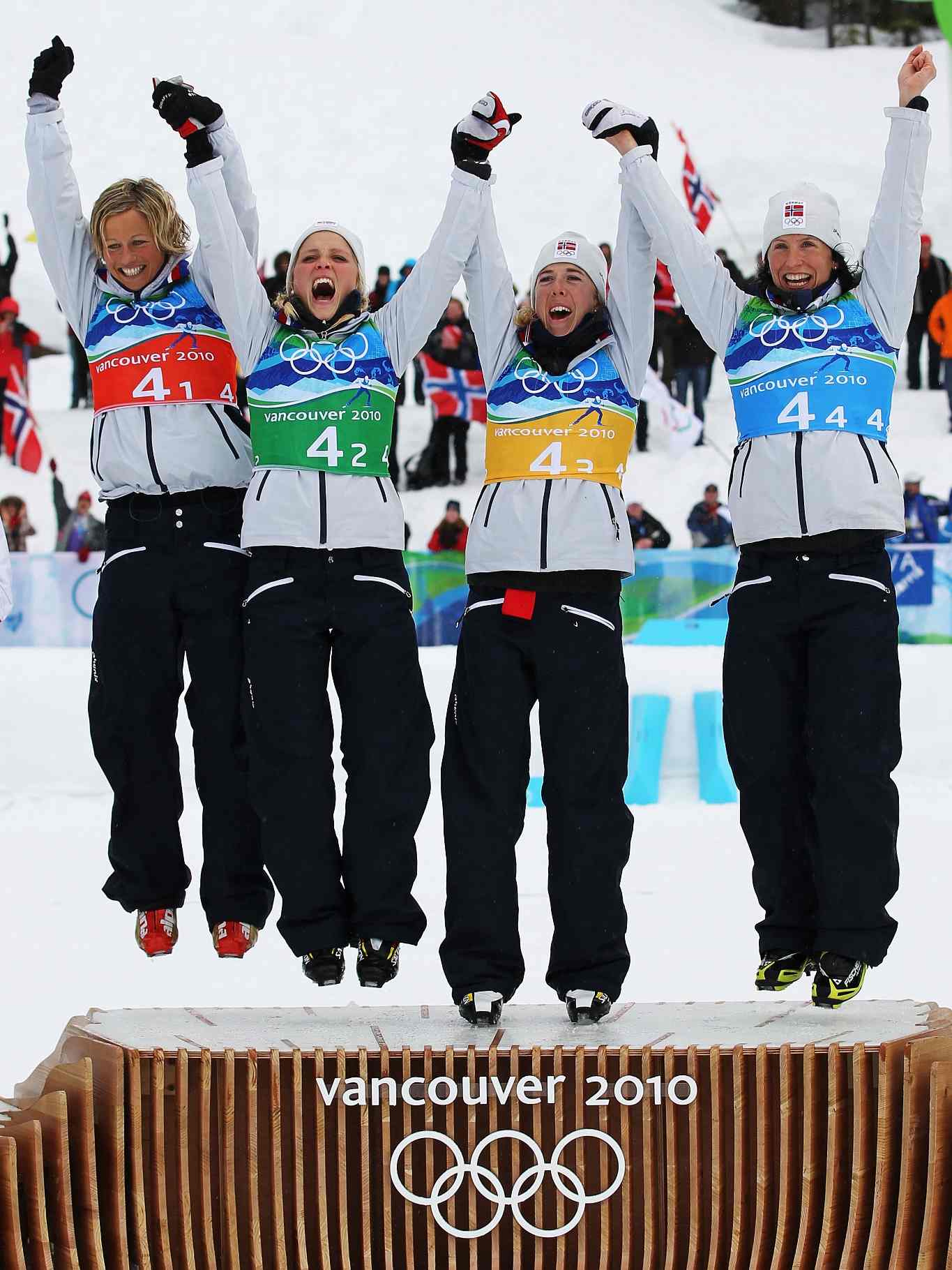 February 25, 2010: (L-R) Vibeke W Skofterud, Therese Johaug, Kristin Stoermer Steira and Marit Bjoergen of Norway celebrate after winning the gold medal during the Ladies' Cross Country 4x5 km Relay on day 14 of the 2010 Vancouver Winter Olympics at Whistler Olympic Park Cross-Country Stadium in Whistler, Canada. /VCG Photo