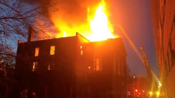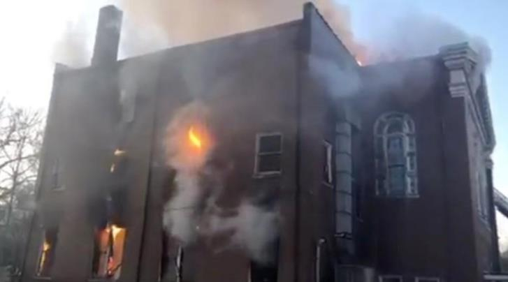 Flames seen at the Karpeles Manuscript Library Museum in St. Louis, Missouri, U.S. in this still image taken from a video provided by St. Louis Fire Department, March 26, 2019/Handout via Reuters