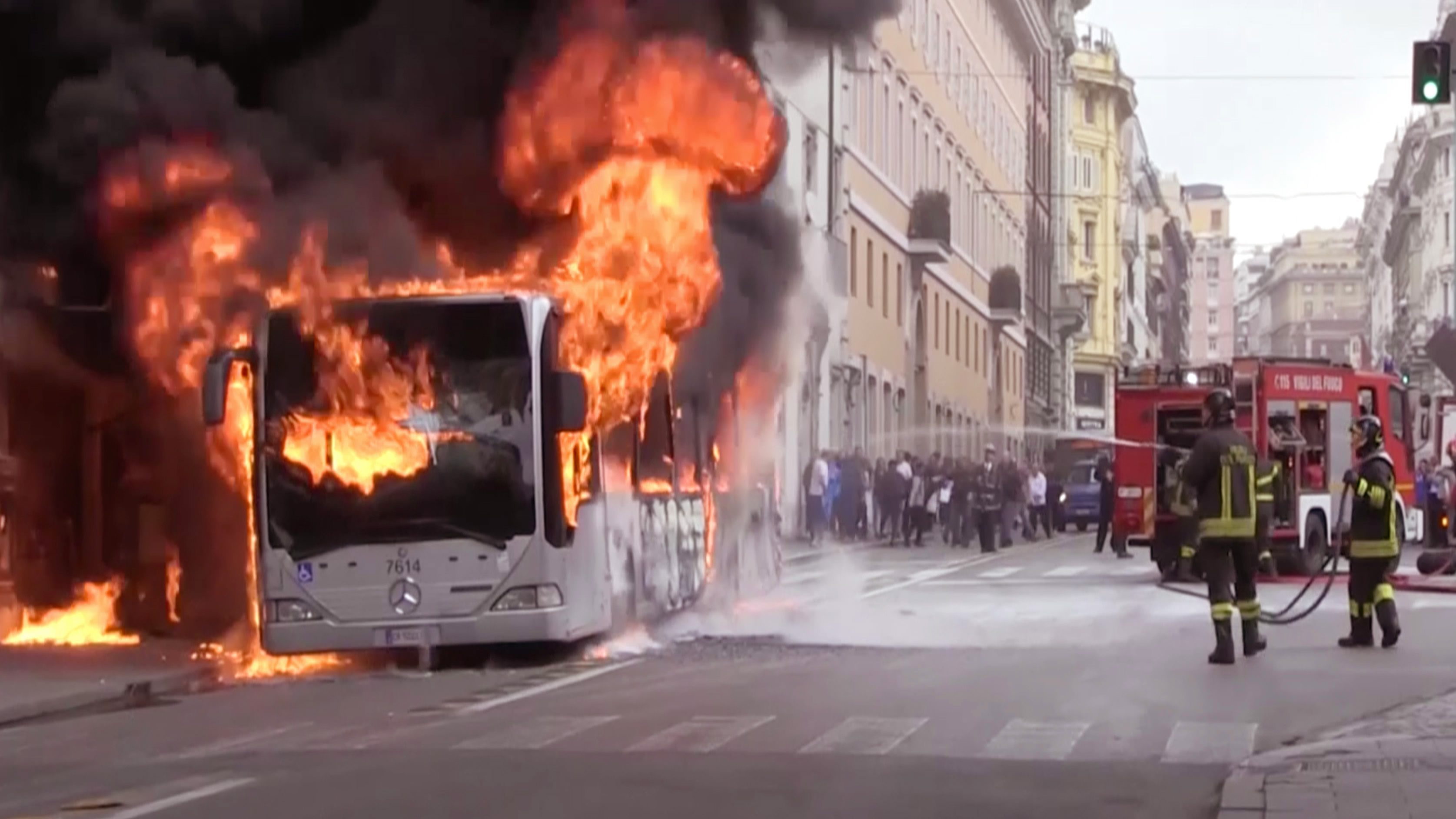 A bus in central Rome burst into flames on Tuesday, leaving one woman slightly burned.