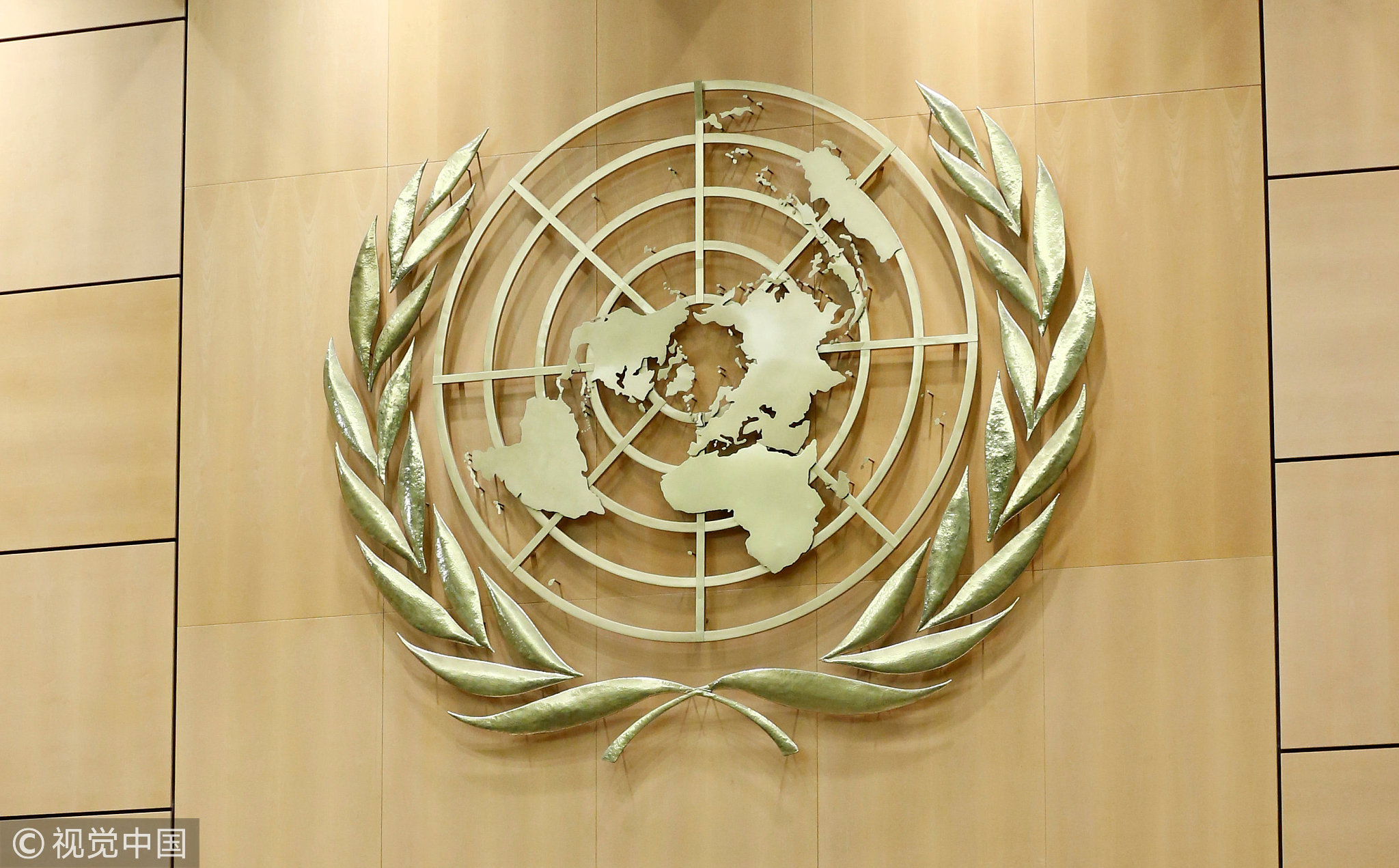 The United Nations emblem is pictured at the 2nd Preparatory session of the 2020 Non-Proliferation Treaty (NPT) Review Conference at the UN headquarters in Geneva, Switzerland, April 23, 2018./ VCG Photo