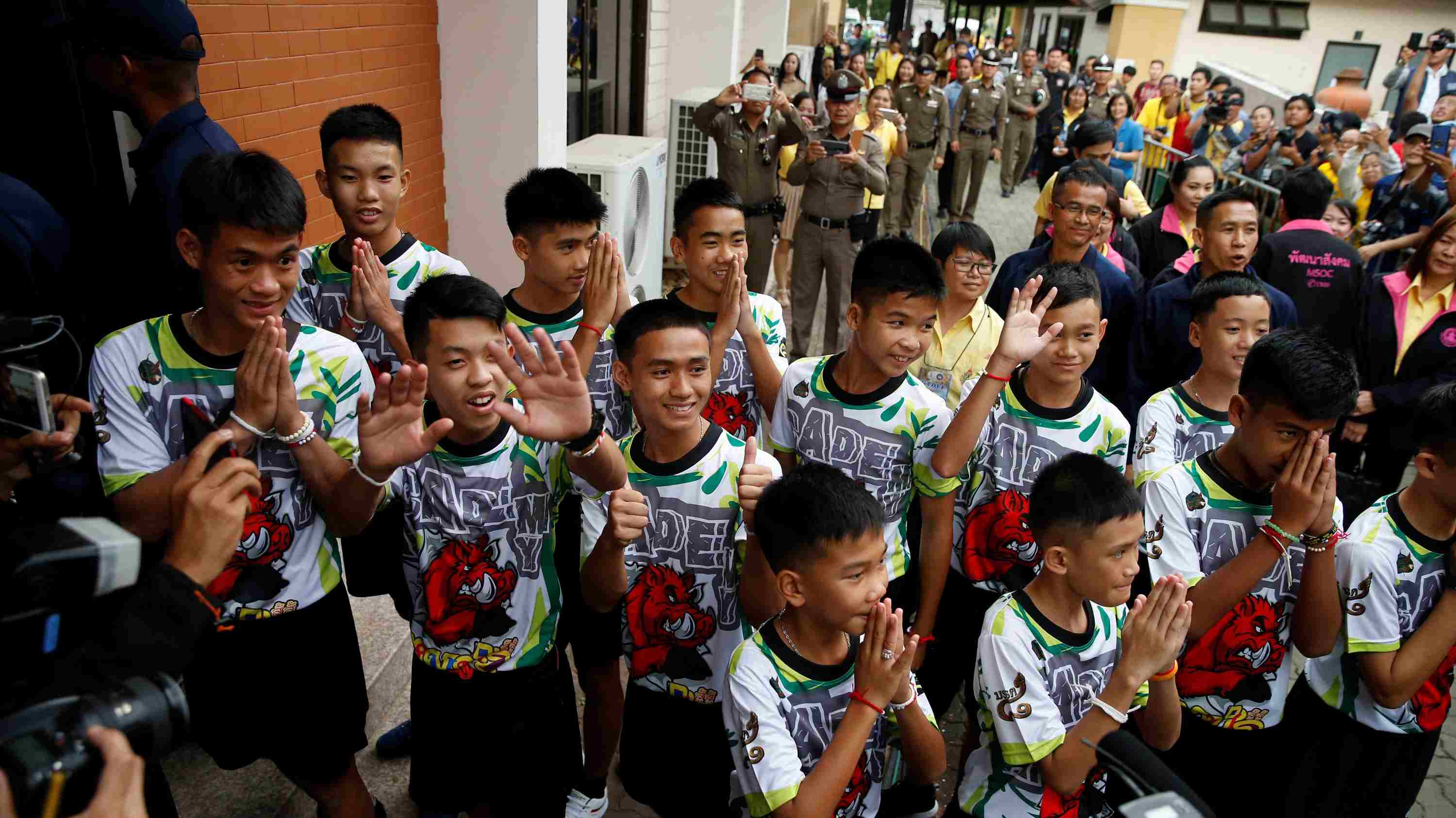 The 12 boys and their soccer coach who were rescued from a flooded cave arrive for a news conference in the northern province of Chiang Rai, Thailand, July 18, 2018. / Reuters Photo