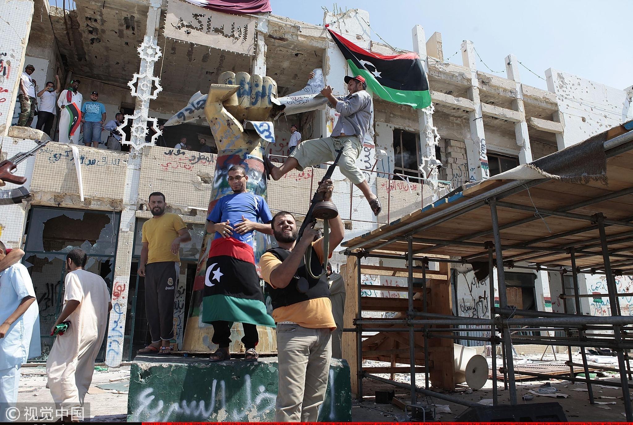 Rebels celebrate in front of the clenched fist representing Gaddafi's government, at the center of his Bab Al Azziziya compound, August 25, 2011 in Tripoli, Libya. /VCG Photo