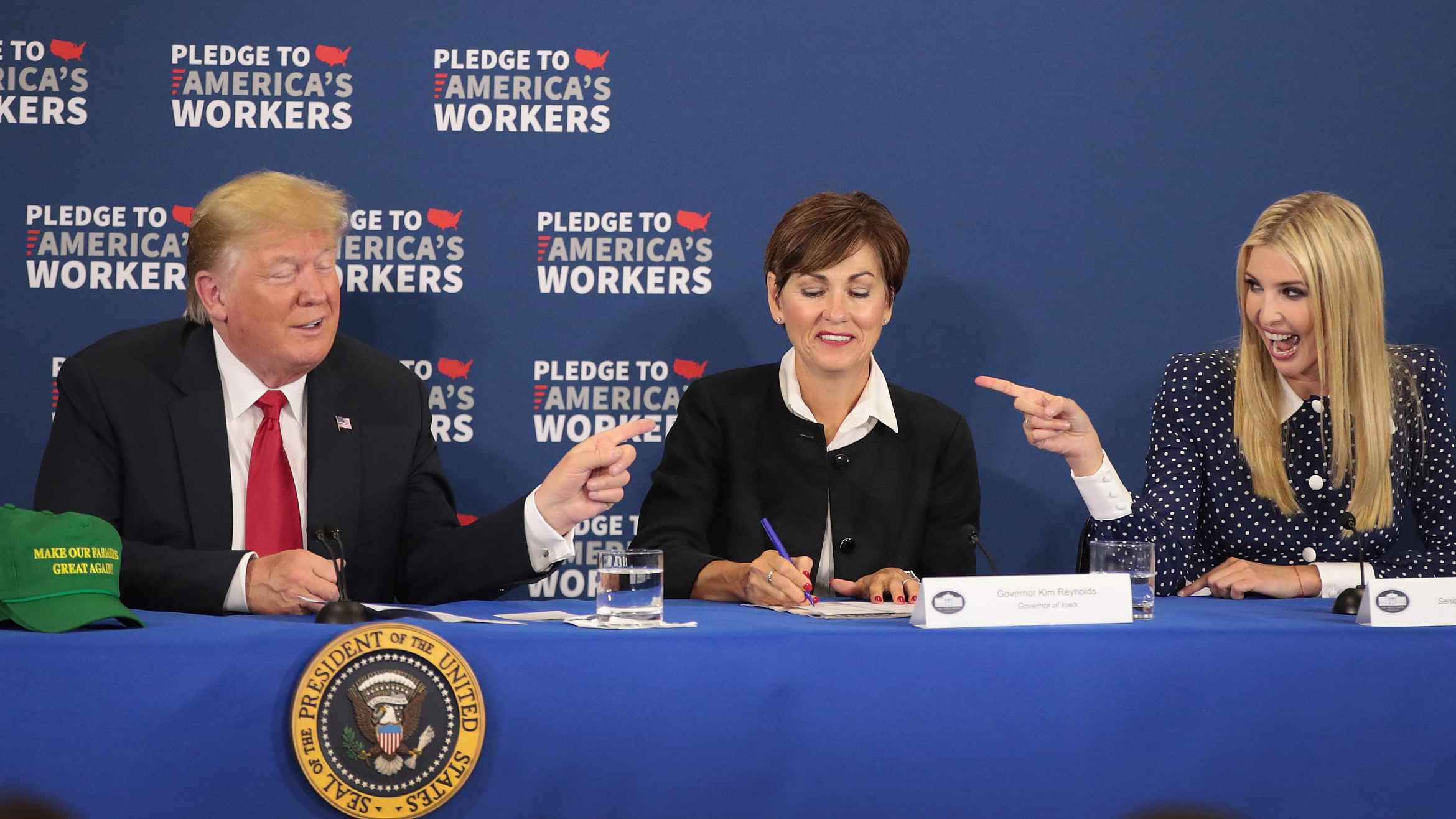 Ivanka Trump (R), Iowa Governor Kim Reynolds (C) and President Donald Trump (L) at Northeast Iowa Community College on July 26, 2018 in Peosta, Iowa. /VCG Photo