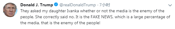 "They asked my daughter Ivanka whether or not the media is the enemy of the people. She correctly said no," Trump tweeted. "It is the FAKE NEWS, which is a large percentage of the media, that is the enemy of the people!"