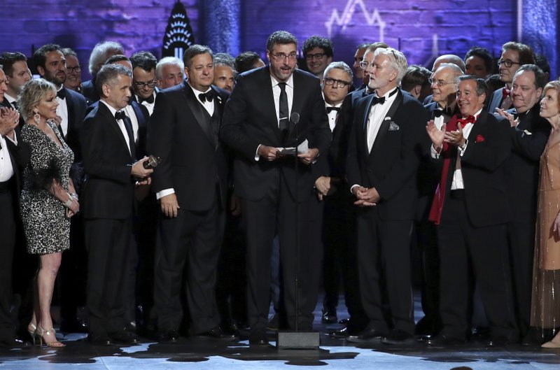Orin Wolf, center, and the cast and crew of “The Band’s Visit” accept the award for best musical at the 72nd annual Tony Awards on June 10, 2018, in New York. /AP Photo