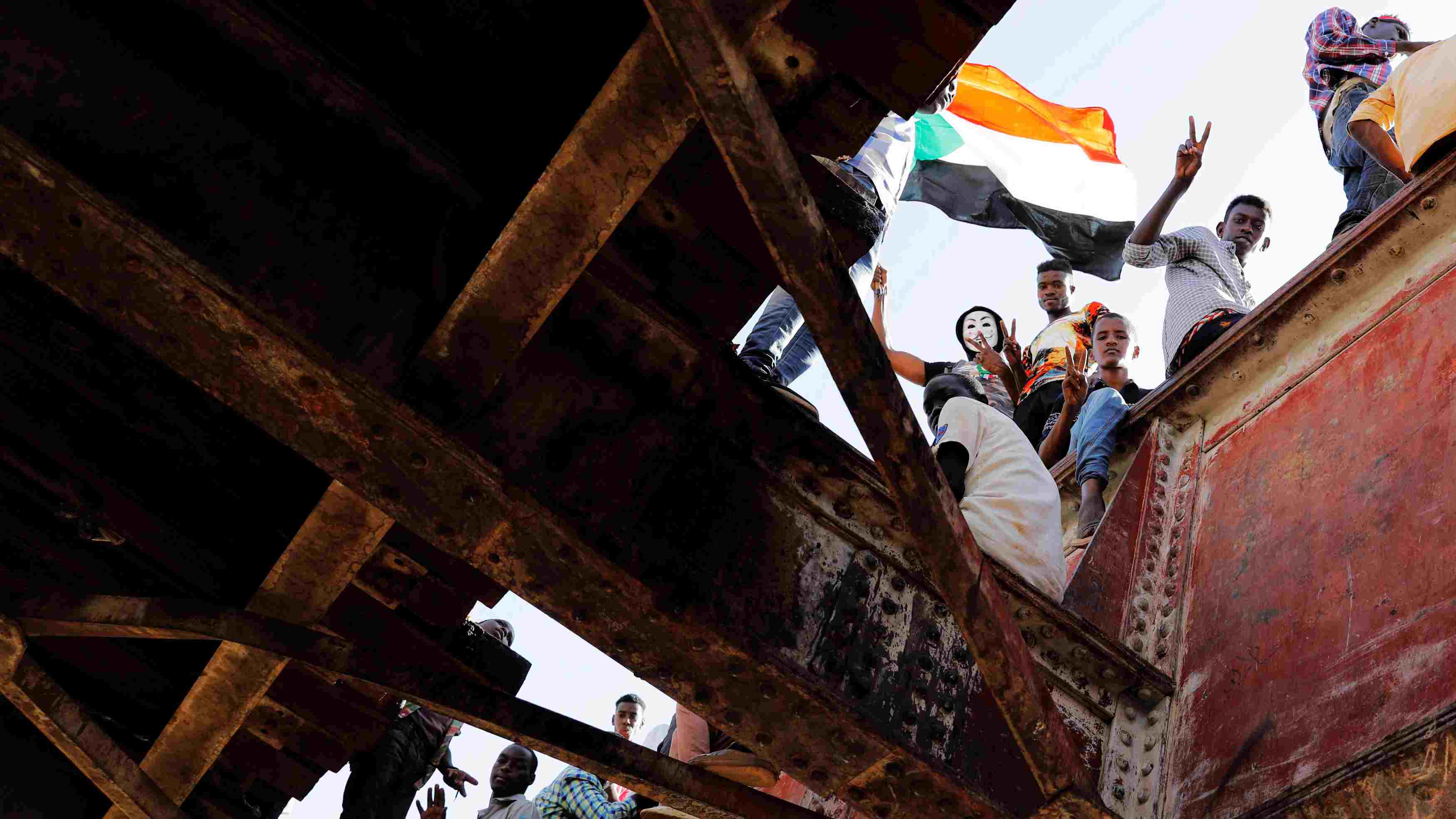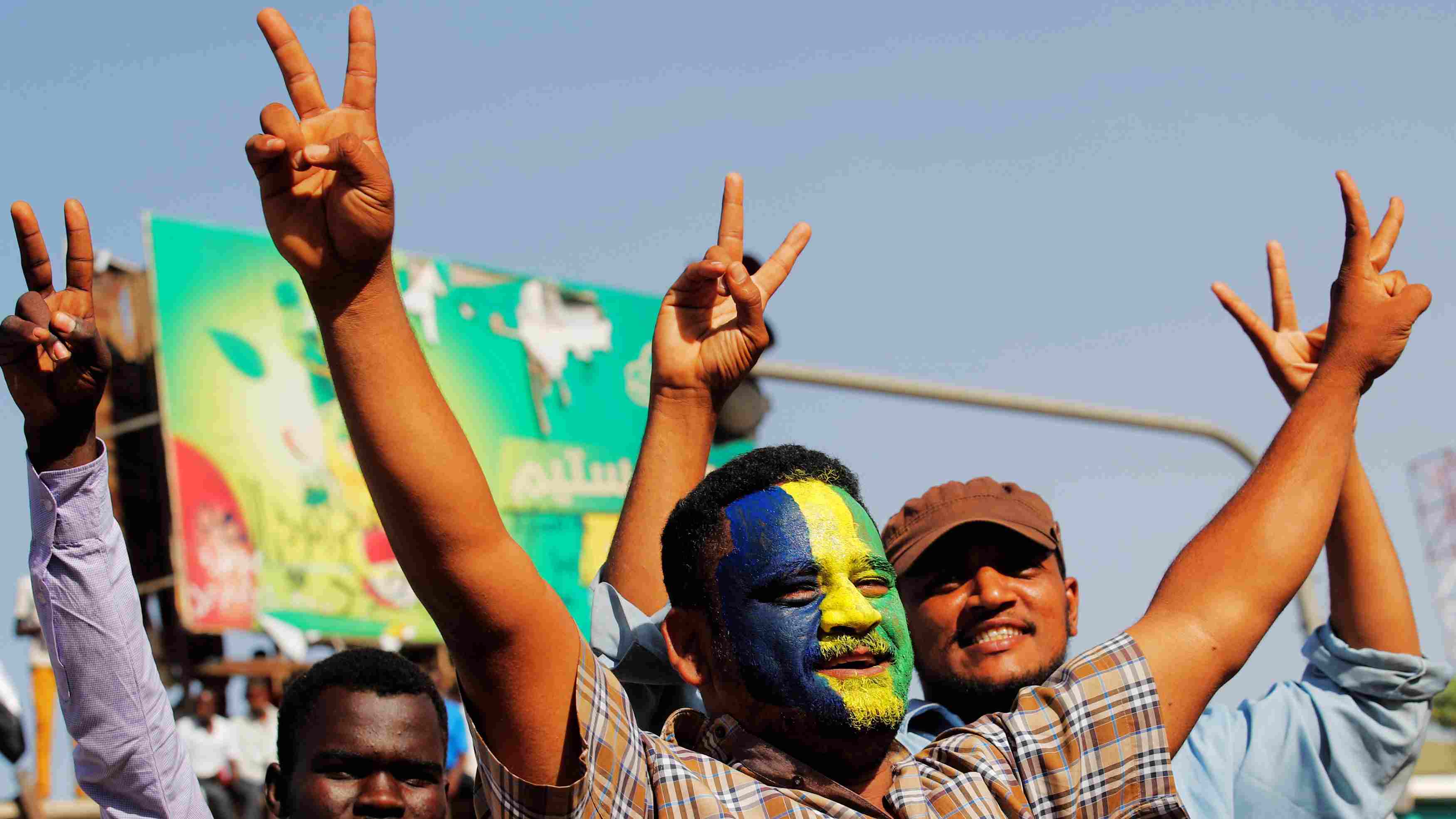 Sudanese protesters wave a national flag and make victory signs as they stand