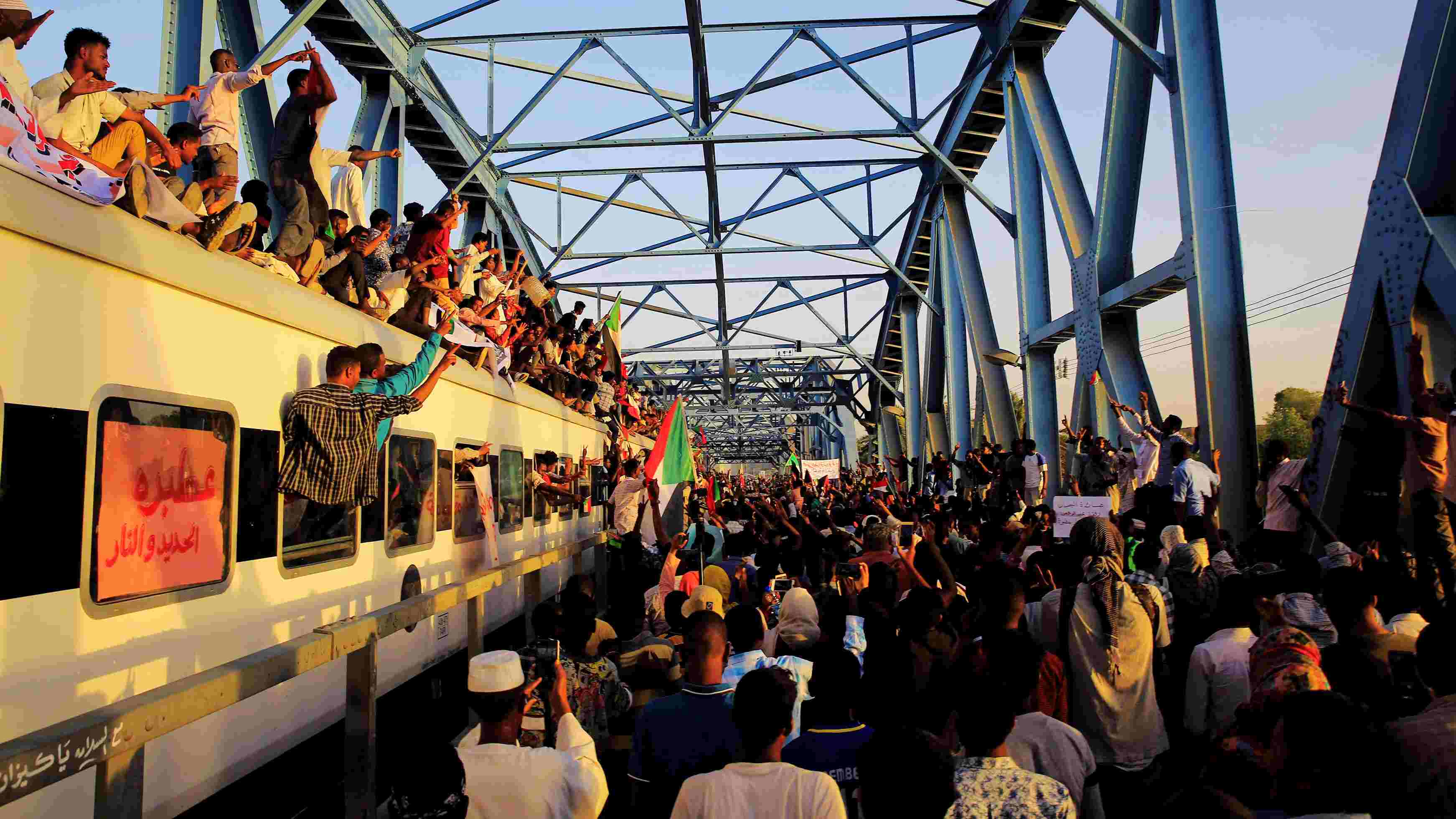 Sudanese demonstrators welcome a train carrying protesters from Atbara, the birthplace of the protests that toppled former Sudanese President Omar al-Bashir, as they approach the military headquarters in Khartoum, Sudan, April 23, 2019. /Reuters Photo