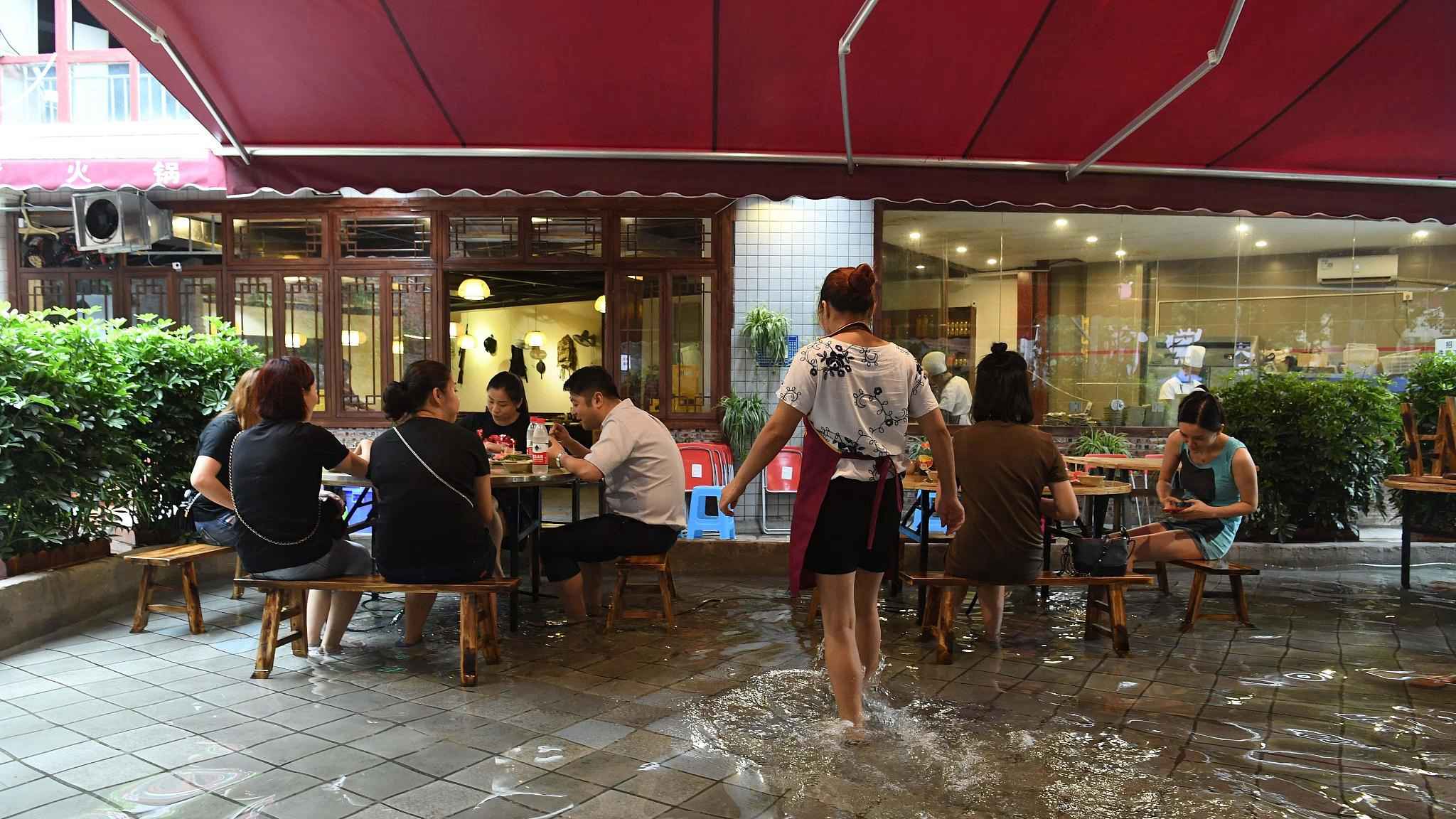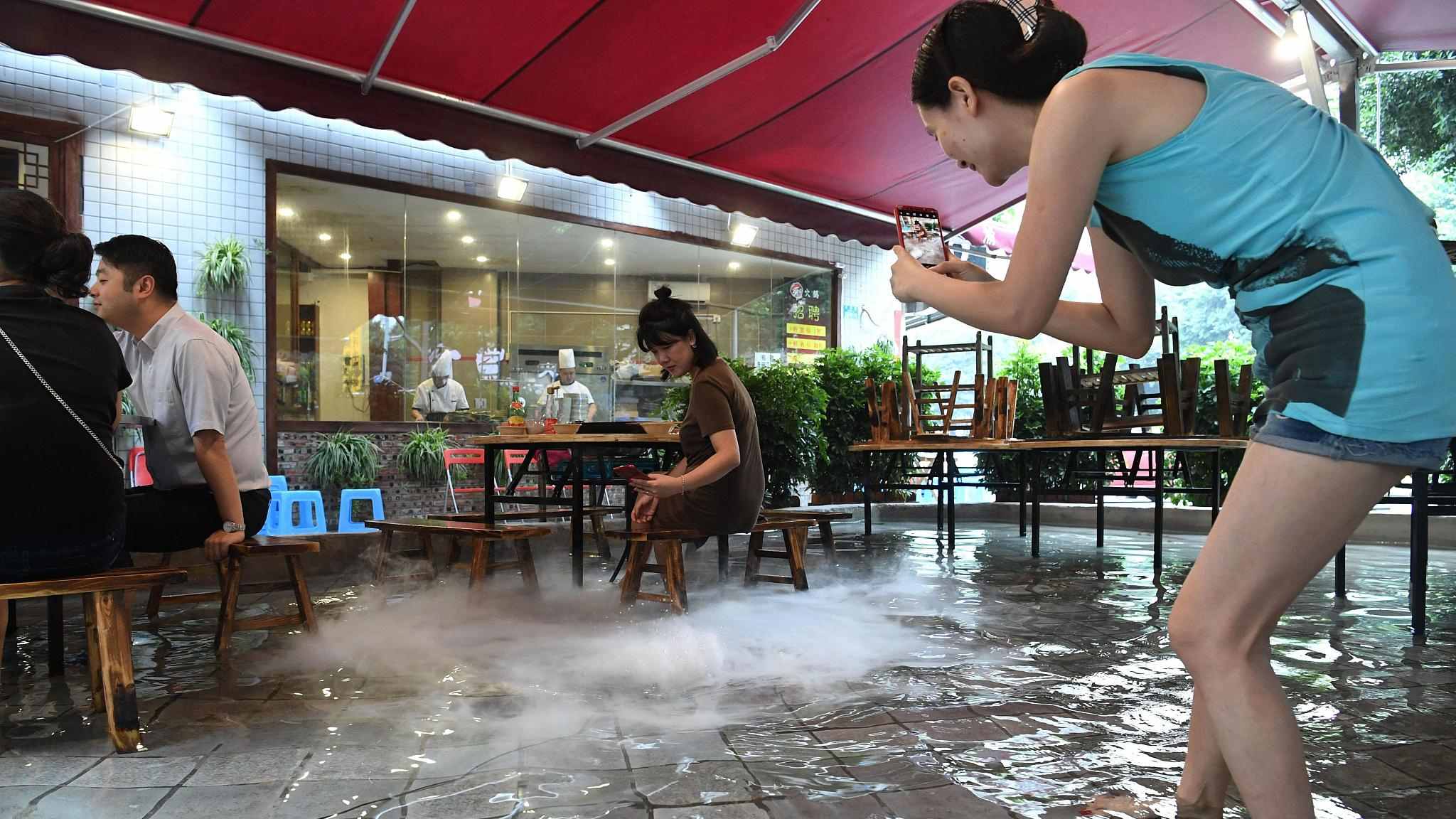 One restaurant in the city has made a splash after moving its tables to a pond which usually keeps goldfish, allowing patrons to dip their feet in cool water as they dip their food in boiling broth. /VCG Photo