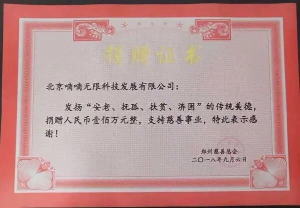 The certificate granted to Didi Chuxing by the Zhengzhou General Charity Foundation /Photo via Henan TV's WeChat account