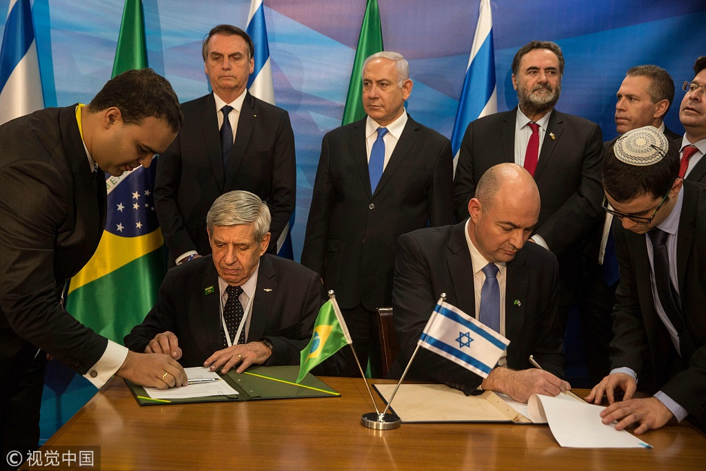 Israeli Prime Minister Benjamin Netanyahu (C, back row) and Brazilian President Jair Bolsonaro (L, back row) witness the signing of bilateral agreements at Netanyahu's office in Jerusalem, March 31, 2019. /VCG Photo