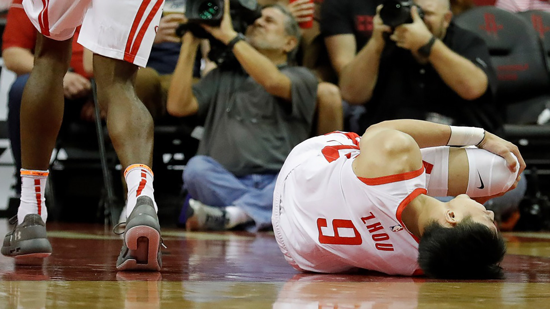 In an exhibition game against the Shanghai Sharks, the Houston Rockets' Zhou Qi injures his knee and leaves the court in a wheelchair. Final score was Houston 128, Sharks, 86.
