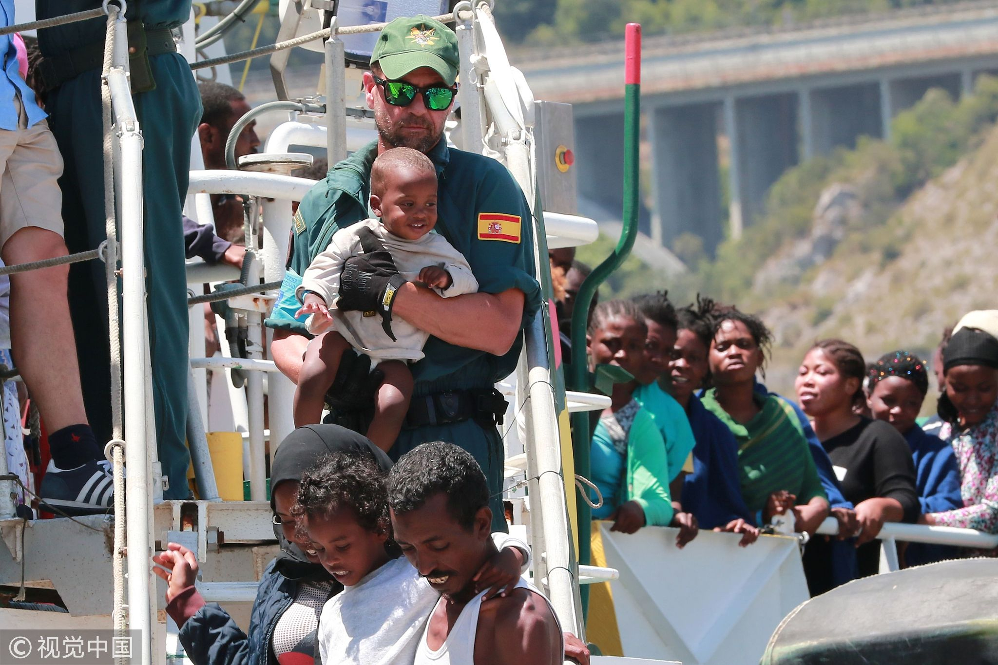 A Guardia Civil officer helps migrants to disembark from the Spanish Guardia Civil Rio Segura Patrol Ship with 1,216 migrants onboard including 256 children and 11 pregnant women, who were rescued in the Mediterranean Sea on June 29, 2017. /VCG Photo.