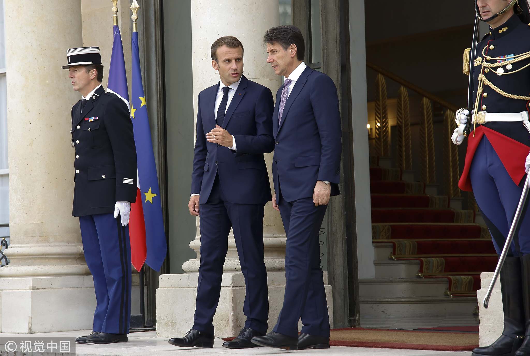 French President Emmanuel Macron (L) receives Italian Prime Minister Giuseppe Conte (R) at the Elysee Palace, after a bitter diplomatic spat between France and Italy over the new Italian government's refusal to give the Aquarius rescue ship, carrying 629 migrants, permission to dock. /VCG Photo.