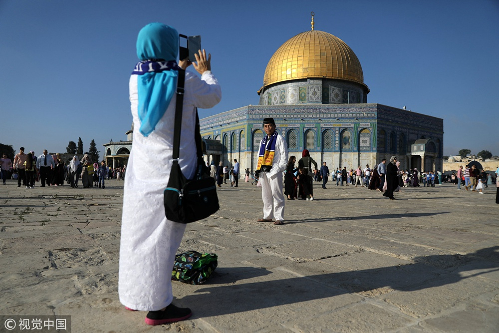 A woman takes a photo of a worshiper following morning prayers marking the first day of Eid al-Adha celebrations, on the compound known to Muslims as al-Haram al-Sharif and to Jews as Temple Mount in Jerusalem's Old City, August 21, 2018. /VCG Photo