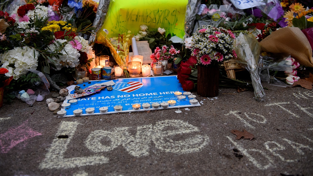 Flowers are placed at a memorial for victims of the mass shooting that killed 11 people and wounded 6 at the Tree Of Life Synagogue in Pittsburgh, Pennsylvania, October 29, 2018. /VCG Photo