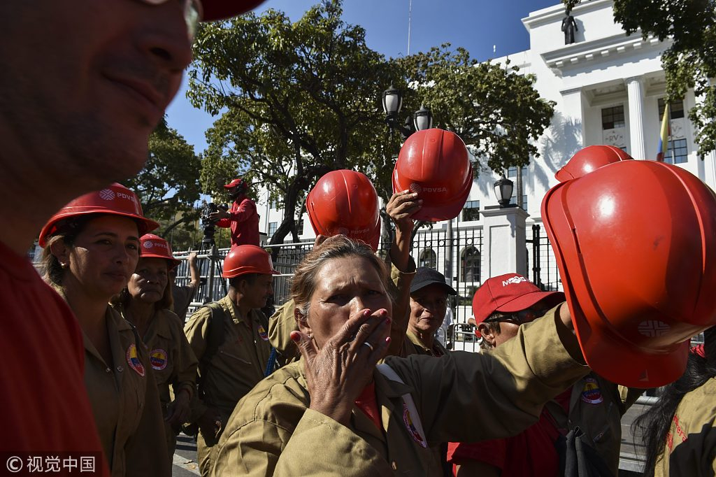 Workers from Venezuela's state oil company, PDVSA, participate in an "anti-imperialist" march to support Venezuelan President Nicolas Maduro, in front of the Miraflores Presidential Palace in Caracas, Venezuela, January 31, 2019. /VCG Photo