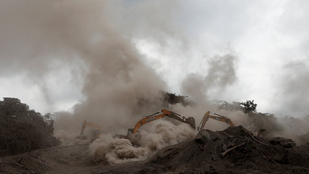 Rescue workers work with excavators at an area affected by the eruption of the Fuego volcano at San Miguel Los Lotes in Escuintla, Guatemala, June 6, 2018. /VCG Photo