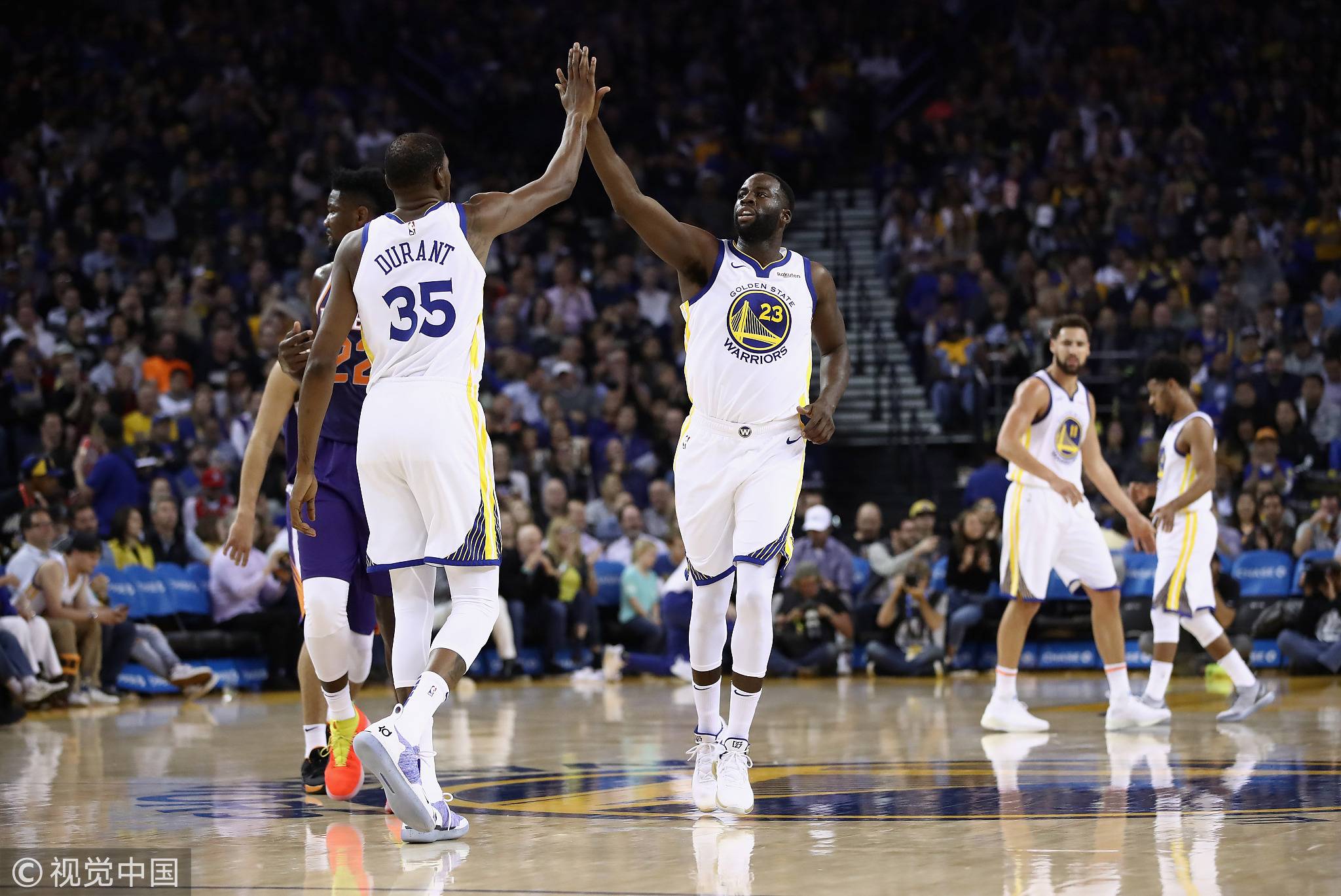 Draymond Green #23 of the Golden State Warriors high fives Kevin Durant #35 after making a basket against the Phoenix Suns at ORACLE Arena, October 22, 2018, in Oakland, California. /VCG Photo
