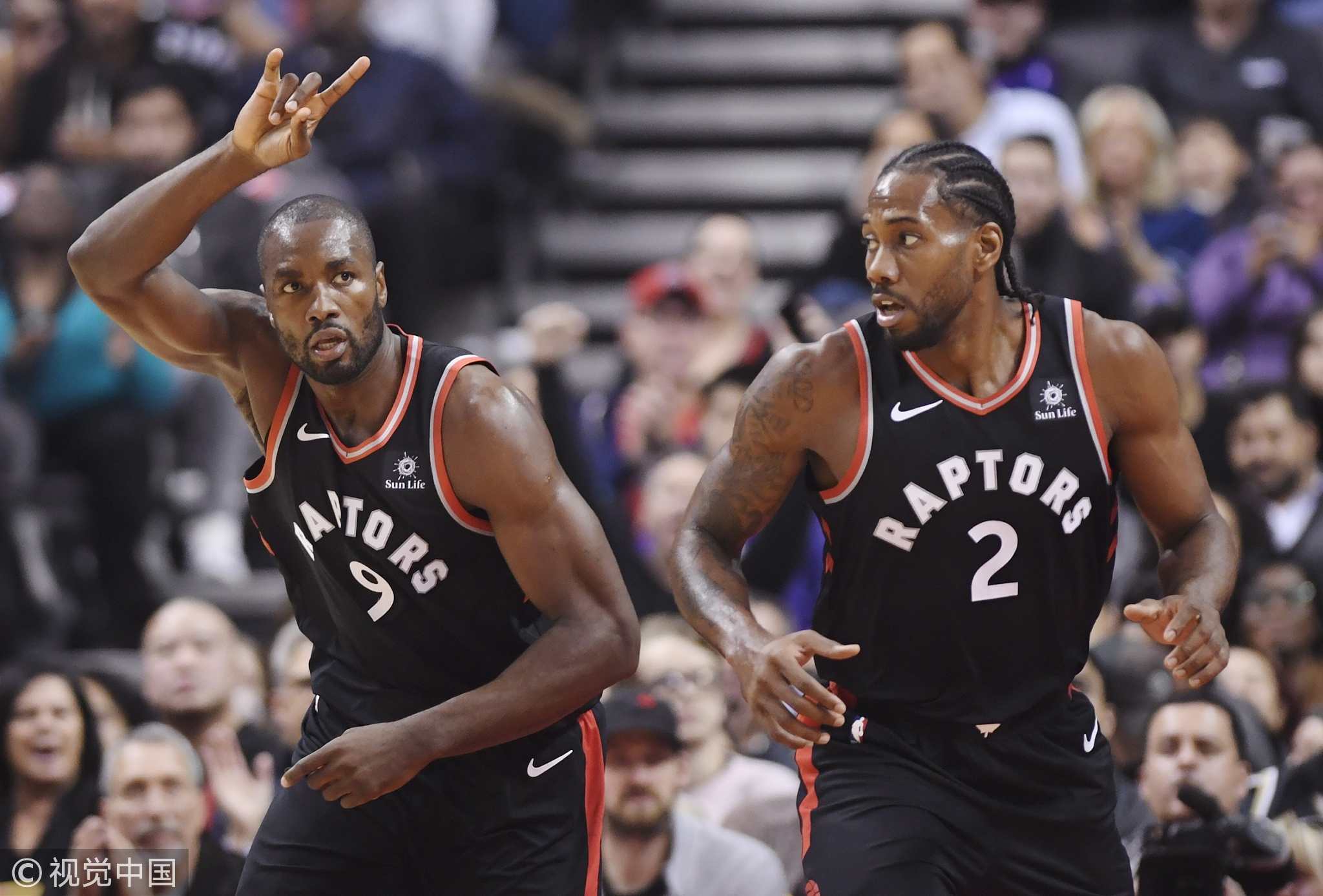 Toronto Raptors forward Serge Ibaka (9) celebrates a basket against the Charlotte Hornets with teammate Kawhi Leonard (2) during first half NBA basketball action in Toronto, October 22, 2018. /VCG Photo