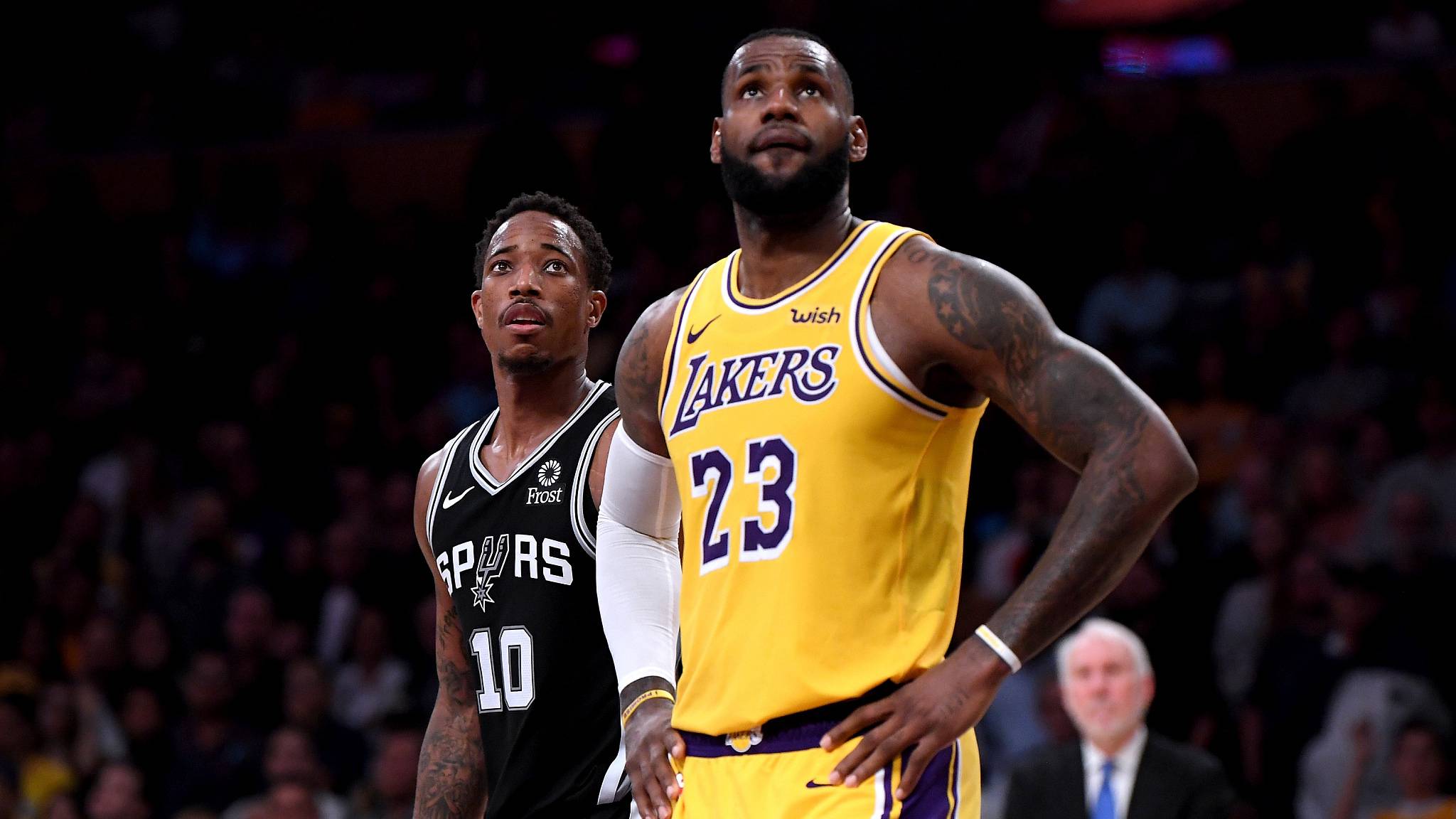 LeBron James #23 of the Los Angeles Lakers misses a last second shot in front of Rudy Gay #22 of the San Antonio Spurs to lose 143-142 in overtime at Staples Center, October 22, 2018, in Los Angeles, California. /VCG Photo
