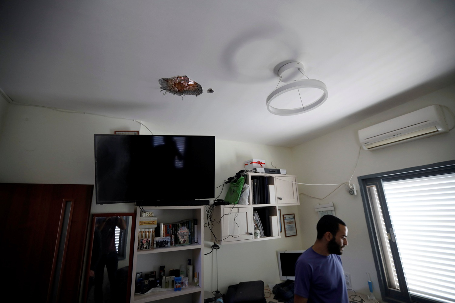 A man looks on inside a damaged house after it was hit by a rocket, fired from Gaza over the border, to the Israeli side in Kiryat Gat, Israel, May 4, 2019. /Reuters Photo