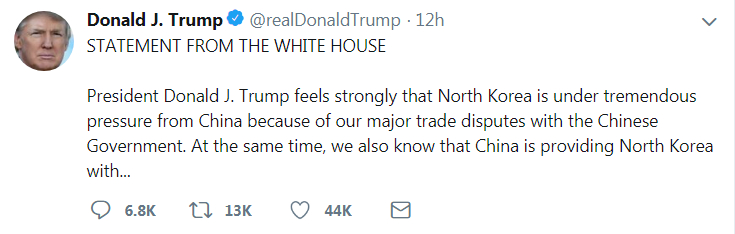 Earlier, the White House released a statement on Trump's official Twitter account, blaming China for the difficulties in the Korean denuclearization.