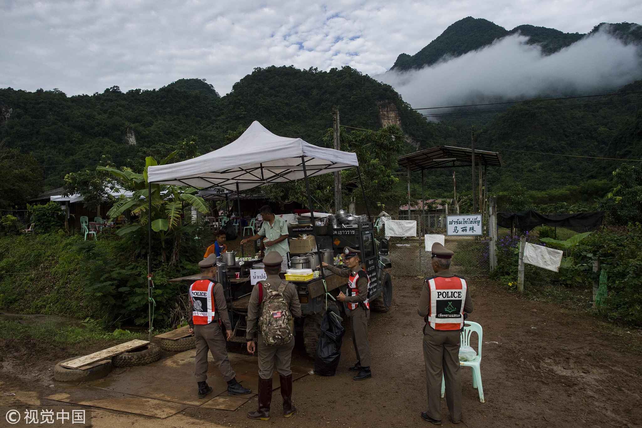 Thai police take a break as rescue operations continue for 12 boys and their coach trapped at the Tham Luang cave in Chiang Rai province, Thailand, July 4, 2018. /VCG Photo