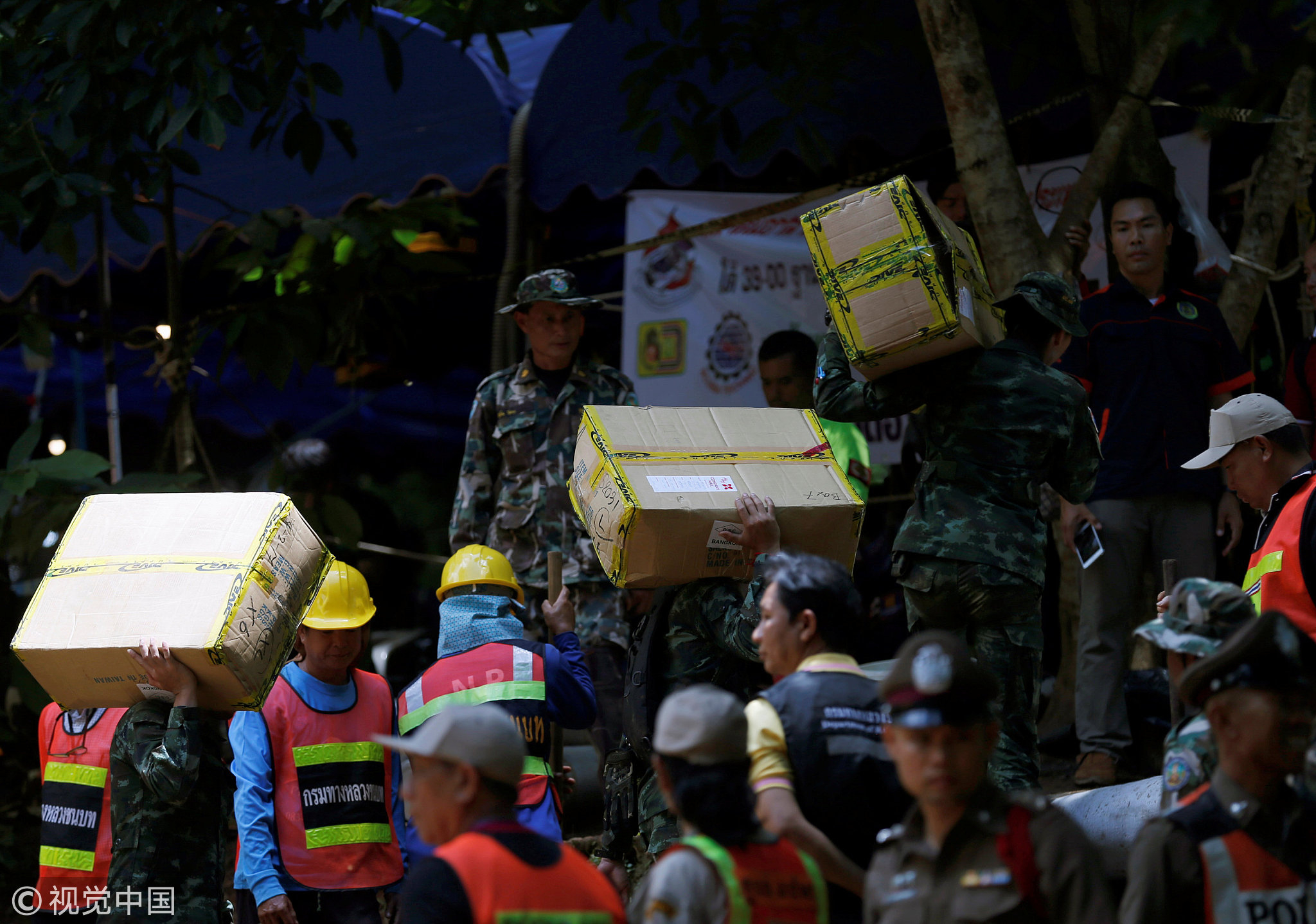 Soldiers and rescue workers carry aid supplies to the Tham Luang cave complex in the northern province of Chiang Rai, Thailand, July 4, 2018. /VCG Photo
