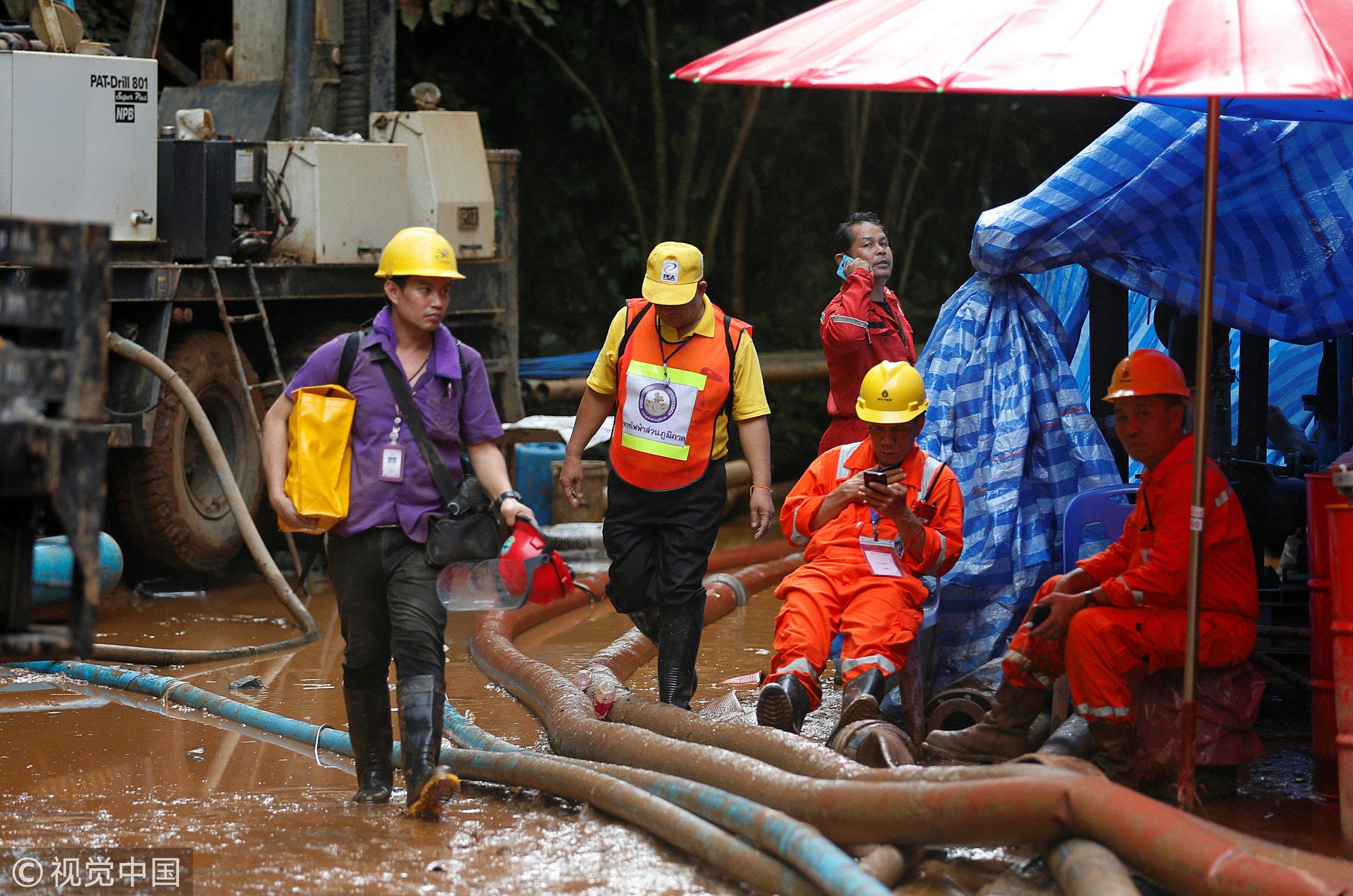 Workers pump water out of the Tham Luang cave complex, July 3, 2018. /VCG Photo