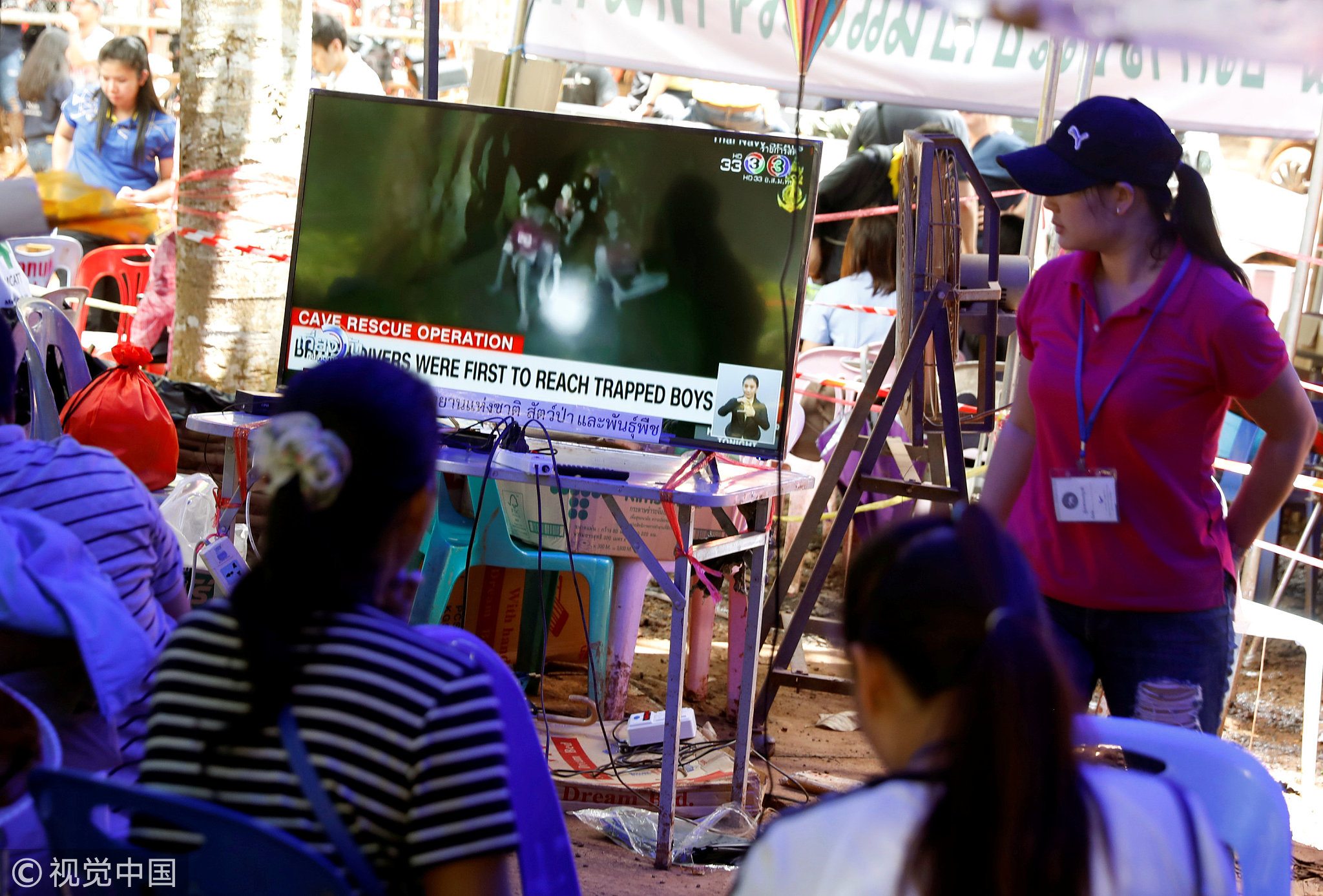 Family members watch a television news broadcast of the trapped football team and their coach, July 4, 2018. /VCG Photo