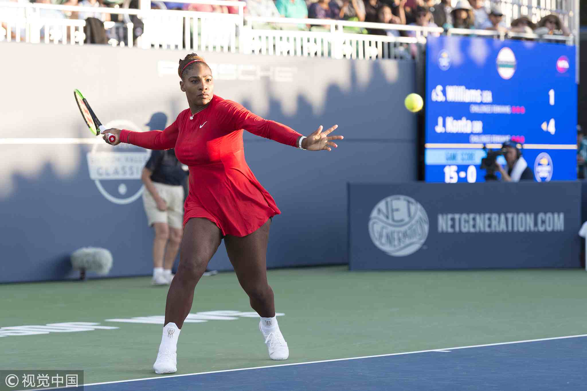 American player Serena Williams is beaten by British player Johanna Konta, 6-1, 6-0, during Mubadala Silicon Valley Classic tennis tournament in San Jose, California, United States, July 31, 2018. /VCG Photo