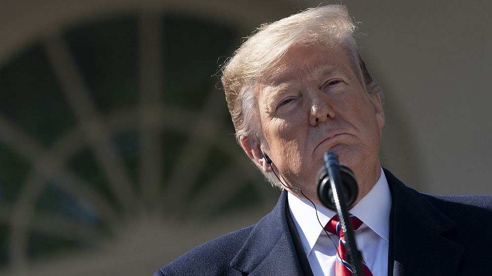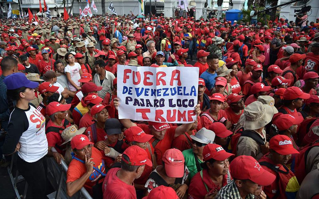 Supporters of Venezuela's President Nicolas Maduro holds a banner that reads "Out of Venezuela Woody Woodpecker Trump" during a rally at the Miraflores Presidential Palace in Caracas, Venezuela, March 9, 2019./VCG Photo