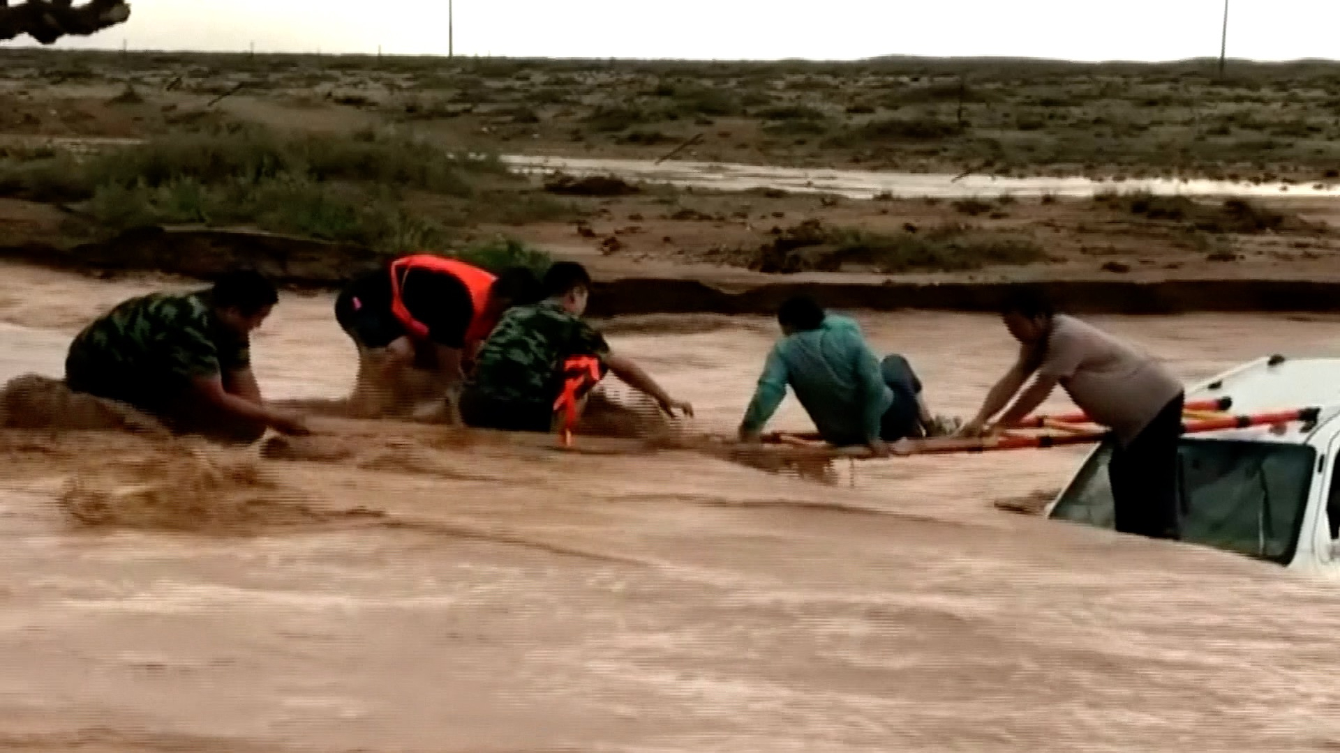 When driving past a bridge in north China, a car lost control and was swept into a river by floodwater from a sudden downpour. With the help of rescuers, the two passengers slowly crawled across the ladder, safely back to land.